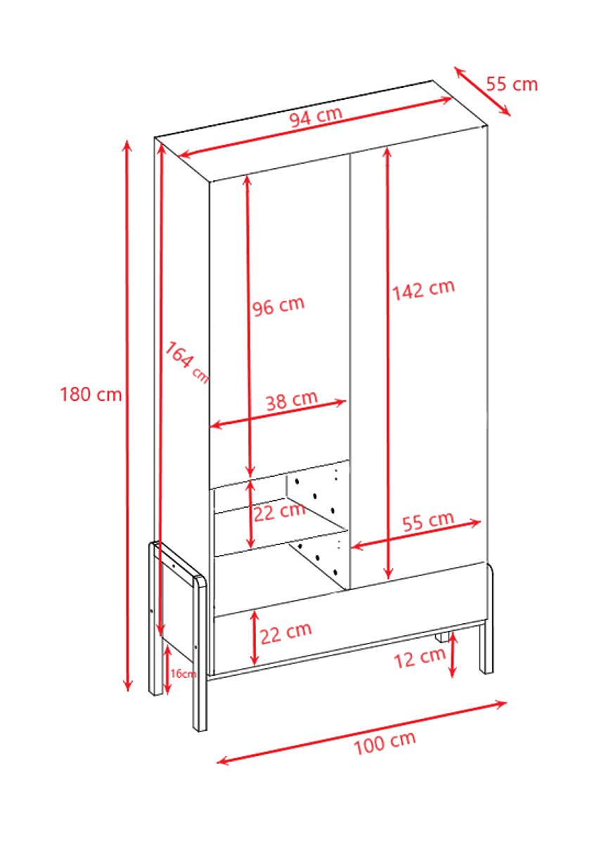 Lo spazio interno dell'armadio è composto da un ampio scomparto con asta appendiabiti e cinque ripiani, di cui due sono aperti e offrono così un comodo accesso agli oggetti di uso quotidiano. Nella parte inferiore dell'armadio c'è un pratico cassetto chiudibile.