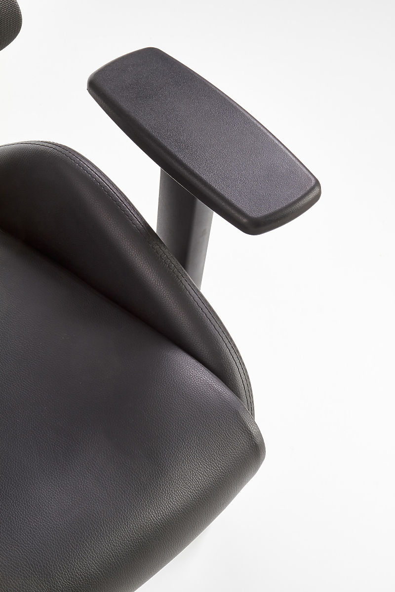 Il meccanismo Multiblock offre la possibilità di dondolare, la cui rigidità può essere regolata da soli. Lo schienale ergonomicamente sagomato e il poggiatesta sono rivestiti in rete traspirante, mentre il sedile della sedia è rivestito in eco-pelle di colore nero. Lo schienale è inoltre dotato di un supporto lombare che garantisce una seduta salutare insieme ai braccioli regolabili. La struttura è realizzata in plastica resistente.