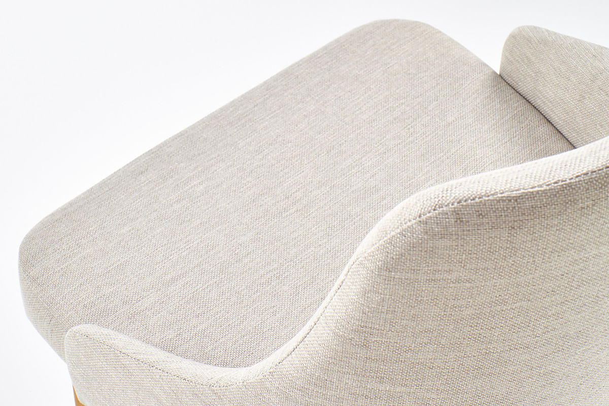 La struttura della sedia è realizzata in legno massello di faggio nella tonalità rovere miele. Il sedile e lo schienale sono rivestiti in un tessuto piacevole di colore crema.
