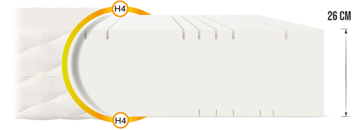 Il materasso in schiuma Goya Max Plus bifacciale con altezza di 26 cm è stato creato per tutti gli amanti della qualità e del sonno confortevole. Grazie ad una serie di tagli trasversali e longitudinali , il materasso è suddiviso in 7 zone . Di conseguenza, è stato ottenuto un aumento significativo della plasticità, che fornisce un eccellente supporto alla colonna vertebrale .