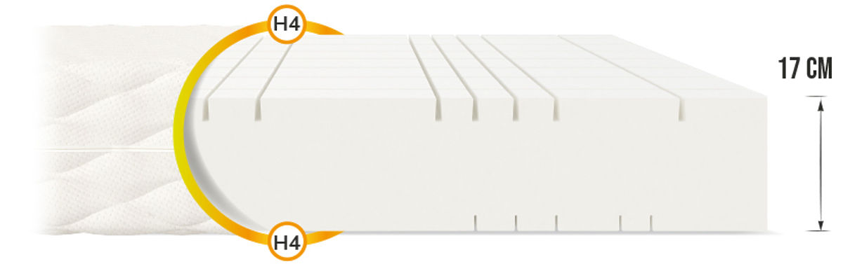 GOYA è un materasso universale in schiuma con un'altezza di 17 cm , che garantisce un sonno di qualità a tutta la famiglia. La sua costruzione è semplice, poiché è stata ricavata da un unico pezzo di schiuma, ma presenta numerosi vantaggi. Il materasso double face è suddiviso in 7 zone grazie ad una serie di tagli longitudinali e trasversali. Ciò porta ad un notevole aumento della plasticità, che fornisce un ottimo supporto alla colonna vertebrale e quindi ti sveglierai riposato e pieno di energia.