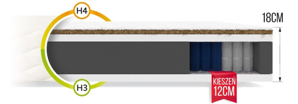 Il nucleo del materasso è costituito da molle insacchettate , ciascuna delle quali è inserita in un'apposita tasca. Le molle non sono interconnesse e funzionano indipendentemente sotto carico. Con la sua forma si adatta alla figura della persona che dorme e fornisce così un ottimo sostegno alla colonna vertebrale . Il materasso è suddiviso in 7 zone di sostegno , dove ciascuna zona rappresenta un sostegno adeguato per una determinata parte del corpo. FAMILY è un modello bifacciale grazie ai diversi gradi di durezza su ciascun lato del materasso, quindi può essere facilmente adattato alle vostre preferenze personali. Un lato del materasso è costituito da schiuma pur e un inserto in cocco, mentre sull'altro lato è presente uno strato di schiuma pur . La schiuma flessibile è resistente alla deformazione e impedisce lo sviluppo di acari e altri microrganismi . Il cocco naturale è traspirante e ha proprietà antiallergiche. Tra le molle e la schiuma è stato inserito un materiale separatore . Questo è un feltro naturale che può prolungare significativamente la vita del materasso e rafforzarne la struttura. I materiali utilizzati sono sicuri, durevoli e resistenti all'usura. Di conseguenza, il materasso FAMILY durerà per molti anni.