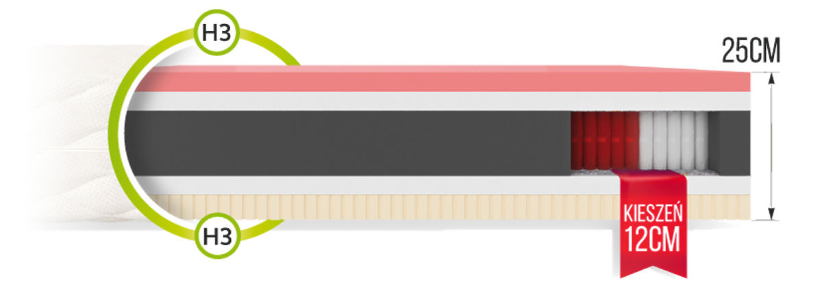 Il materasso COMFORT di 25 cm di altezza è un modello confortevole con molti strati, ognuno dei quali migliora la qualità del sonno. La base del materasso è un inserto a molle insacchettate multiple, che ha un numero aumentato di tasche con molle. Le molle insacchettate multiple sono molte di più rispetto alle comuni molle insacchettate. Le molle dividono il materasso in 7 zone, ognuna delle quali offre un supporto adeguato per la parte del corpo corrispondente. Grazie a questa soluzione, le singole molle si piegano individualmente e si adattano alla forma del corpo della persona sdraiata. Il materasso è anche consigliato per le coppie, poiché riduce il disagio derivante dai movimenti dell'altra persona, garantendo così un sonno profondo e ininterrotto.