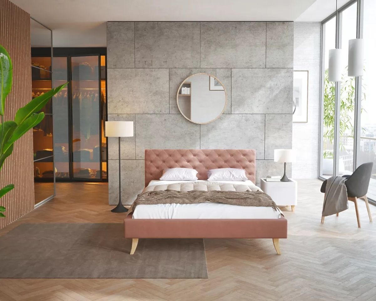 Il materiale di rivestimento del letto imbottito è un velluto rosa antico Trinity. Si distingue per la sua struttura fine e allo stesso tempo per l'alta resistenza anche alla luce solare. È morbido, soffice e piacevole al tatto. Inoltre, è molto resistente all'abrasione e al pilling. Vi colpirà per il suo aspetto moderno e per le cuciture decorative della testiera del letto.