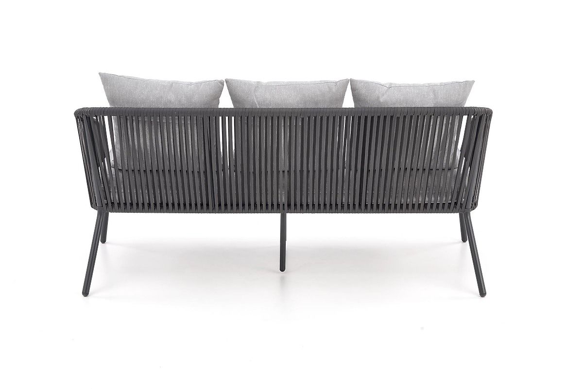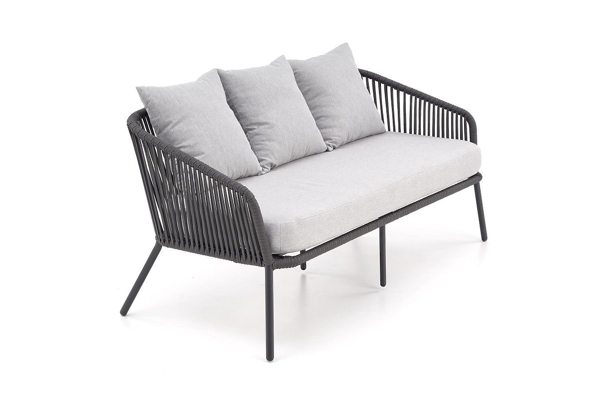 Il set comprende un divano a due posti, due poltrone, un tavolo e cuscini.