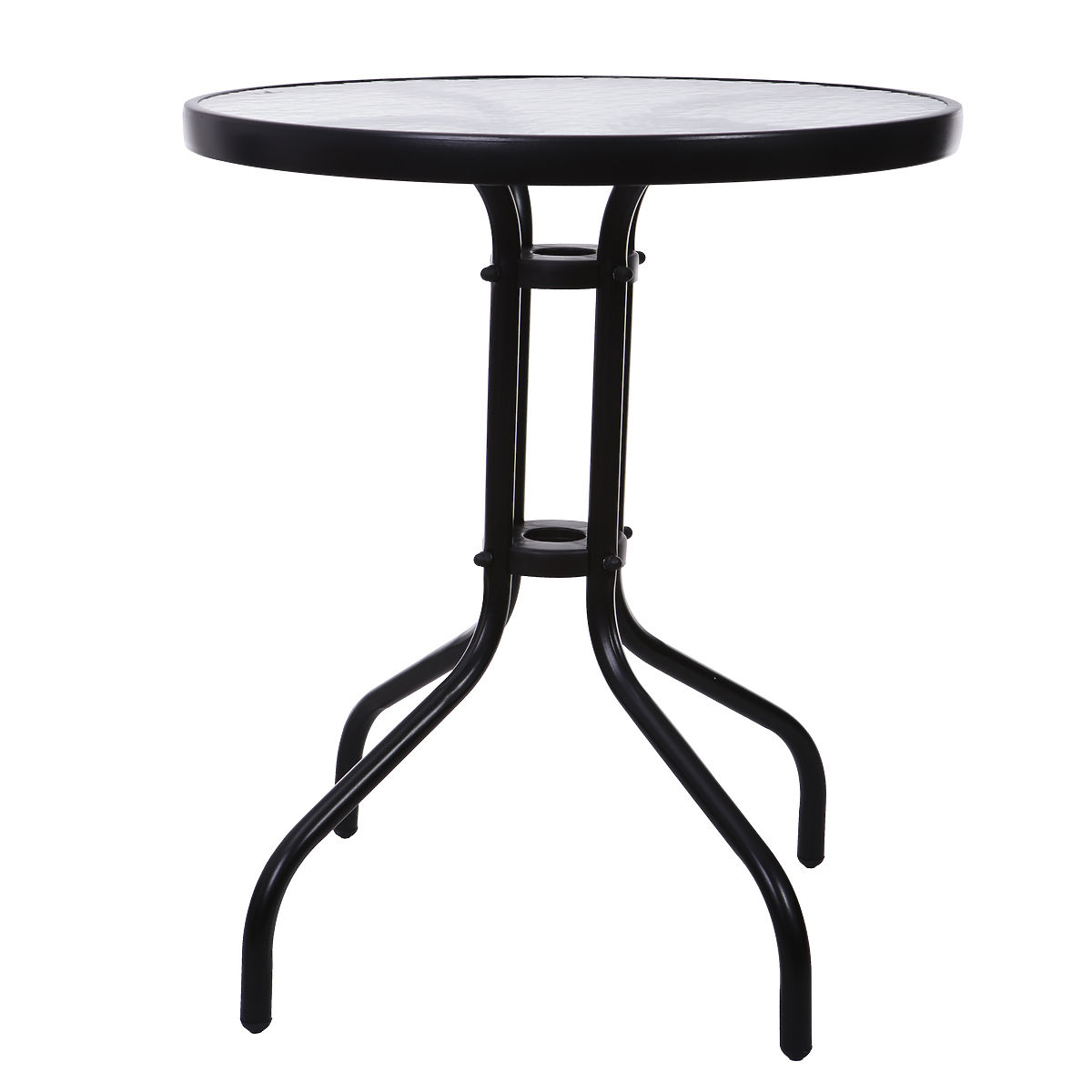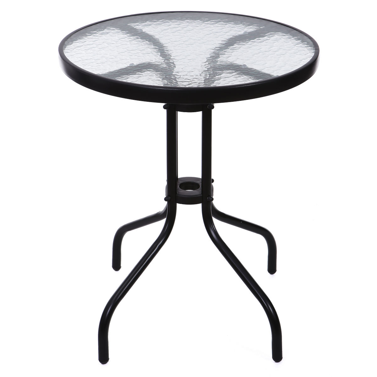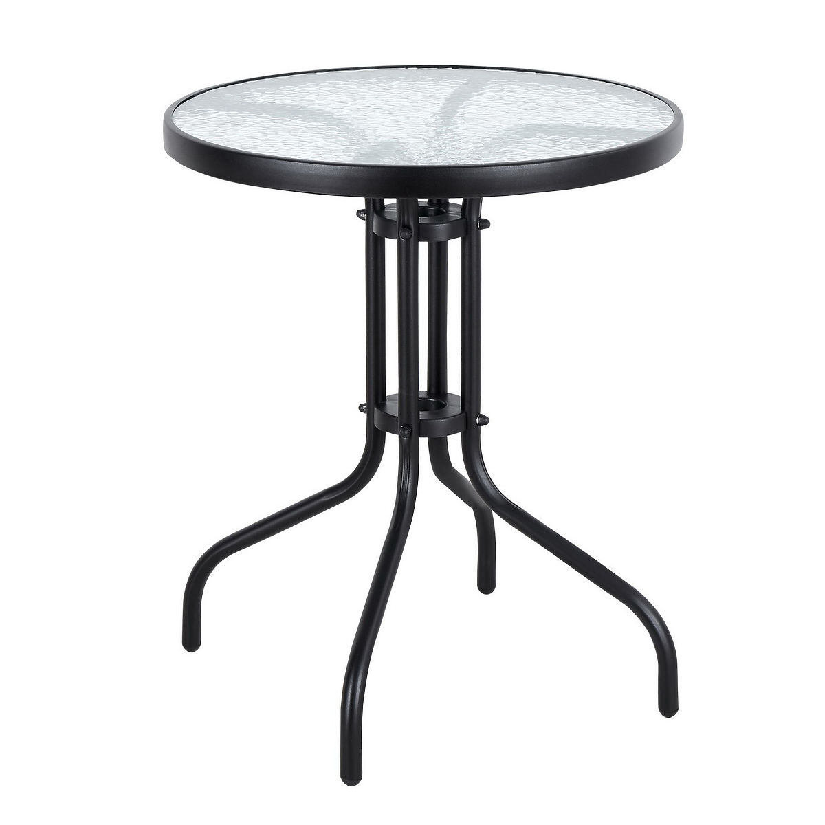 TAVOLINO DA GIARDINO BEN PROGETTATOIl tavolino può ospitare 4 persone grazie al grande piano con diametro di 60 cm, realizzato in vetro temperato. Questo materiale è resistente ai graffi, allo sporco ed è difficile da danneggiare. Ai bordi del tavolo è visibile una cornice nera che aggiunge un tocco moderno.