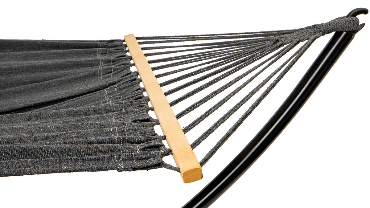 L'amaca è realizzata in materiale resistente che si adatta perfettamente al corpo. Le aste di legno, attraverso le quali sono infilate le corde di fissaggio, assicurano che la superficie destinata a sdraiarsi sia correttamente tesa e non si attorcigli.