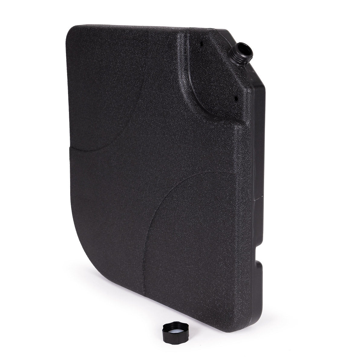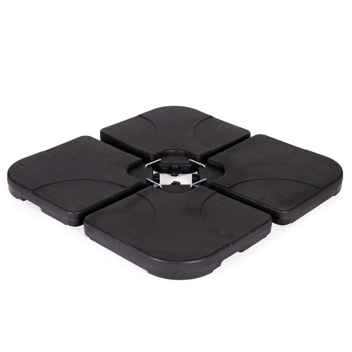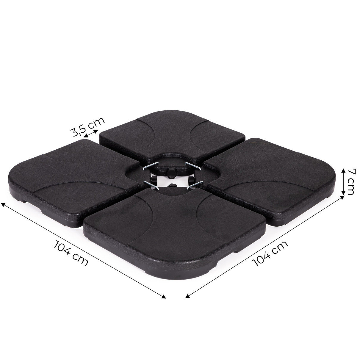 SOLIDO E PRATICOIn ciascuno dei 4 elementi della base c'è un tappo rimovibile, che una volta svitato permette di riempire la base con acqua. Il pannello riempito d'acqua può contenere fino a 15 l, il peso totale della zavorra una volta riempito raggiunge circa 60 kg, il che consente di sostenere anche un grande ombrellone.