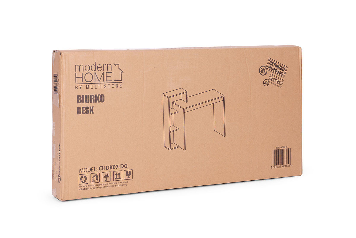 Scrivania moderna e design semplice, questa è l'offerta per gli amanti dello stile insolito e della funzionalità. Il piano e i ripiani sono realizzati in truciolato, rivestiti in laminato grigio. Grazie a ciò, i mobili hanno una leggera lucentezza e appaiono molto lussuosi.