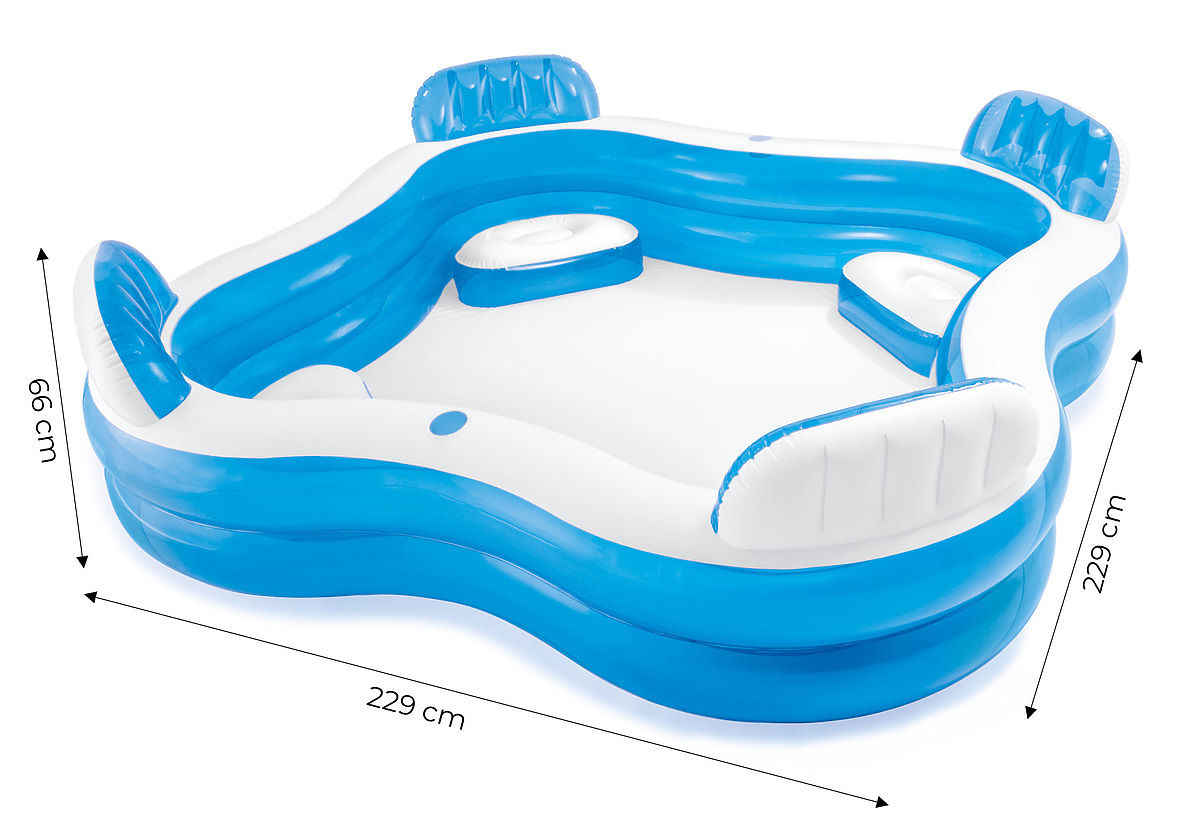 La piscina è realizzata in materiale PVC, ha un piacevole design colorato e sedili con schienali in ciascuno dei quattro angoli - una scelta ideale per il relax per voi e la vostra famiglia.