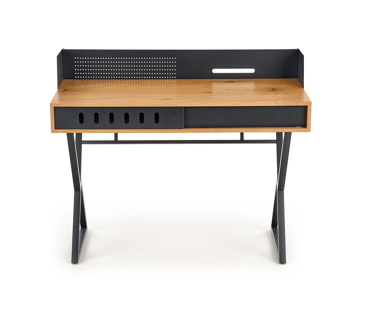 Scrivania moderna con un design elegante che combina rovere dorato e colore nero. È realizzata in MDF impiallacciato e acciaio verniciato a polvere, garantendo alta qualità e resistenza. Ideale per l'ufficio domestico o l'angolo di lavoro.