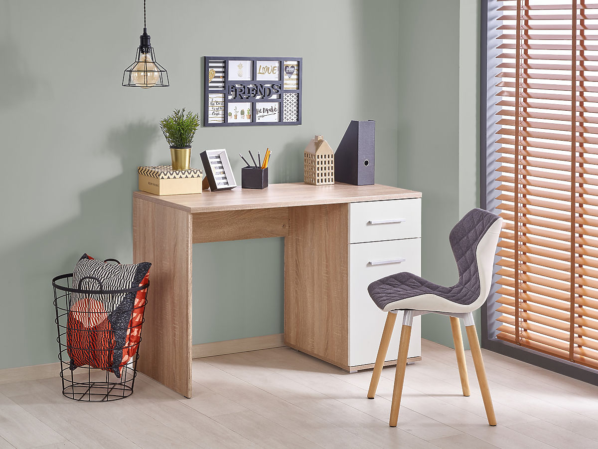 Scrivania elegante nei colori rovere sonoma/bianco, che combina un aspetto moderno e caratteristiche pratiche. Realizzata in pannello laminato con bordi in ABS, è ideale per un lavoro efficiente e organizzato.
