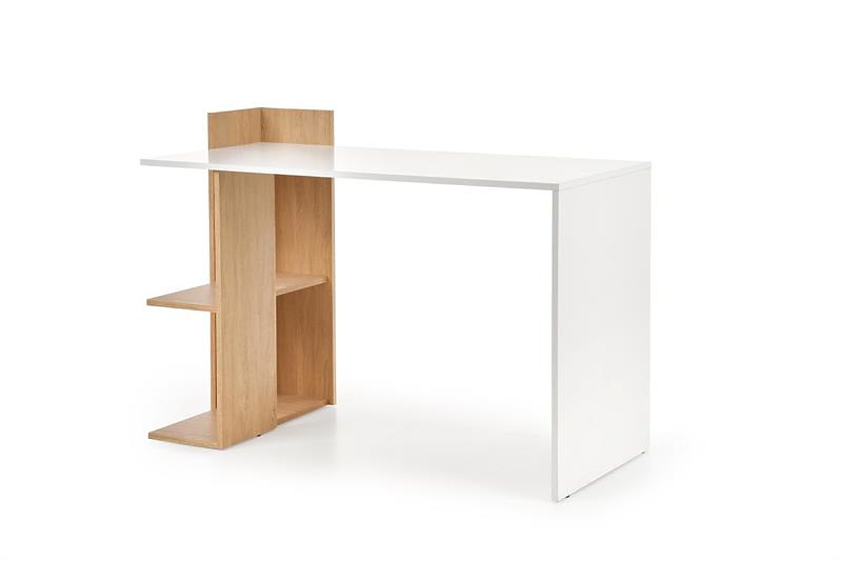 Scrivania moderna in combinazione di rovere dorato e bianco, ideale per l'ufficio domestico o lo spazio di studio. Realizzata in pannello di mobili laminato di alta qualità, offre uno spazio di lavoro elegante e pratico.