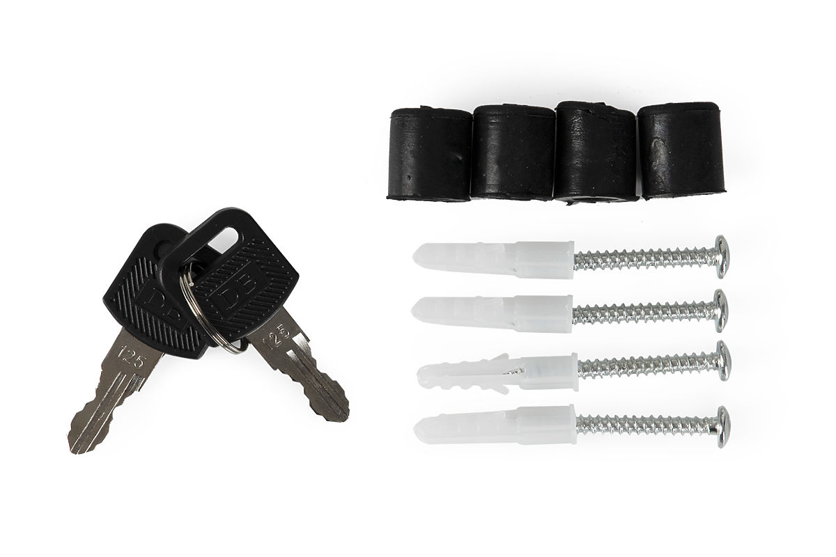 Insieme alla cassetta postale riceverete un kit di montaggio - 4 tasselli e distanziatori, che vi permetterà di iniziare l'installazione della cassetta subito dopo l'apertura. Nella confezione sono incluse due chiavi per aprire la cassetta.