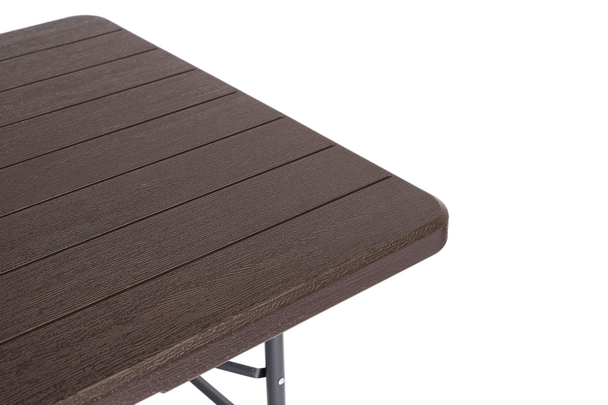 Il piano del tavolo è realizzato in materiale HDPE resistente a tutte le condizioni atmosferiche esterne. L'aspetto del piano ricorda la texture del legno, svolgendo anche una funzione decorativa aggiuntiva. Il piano è molto facile da mantenere e non si sporca.