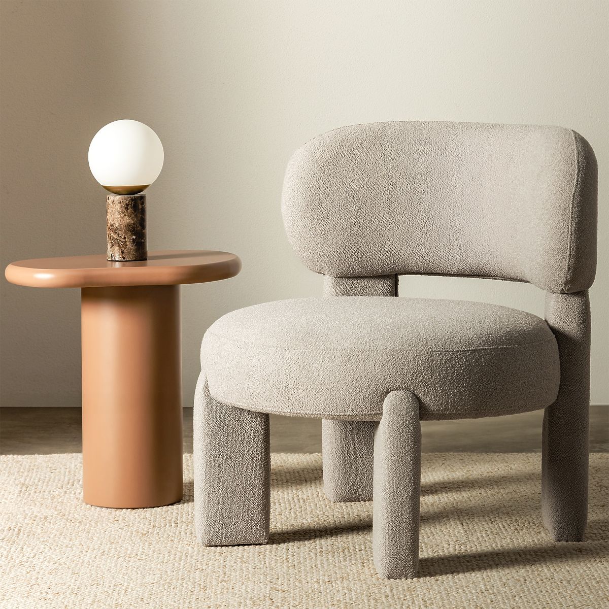 Poltrona Falone in tessuto boucle grigio-beige con forme arrotondate. .. altro