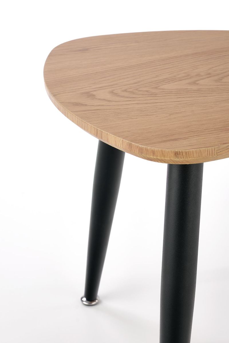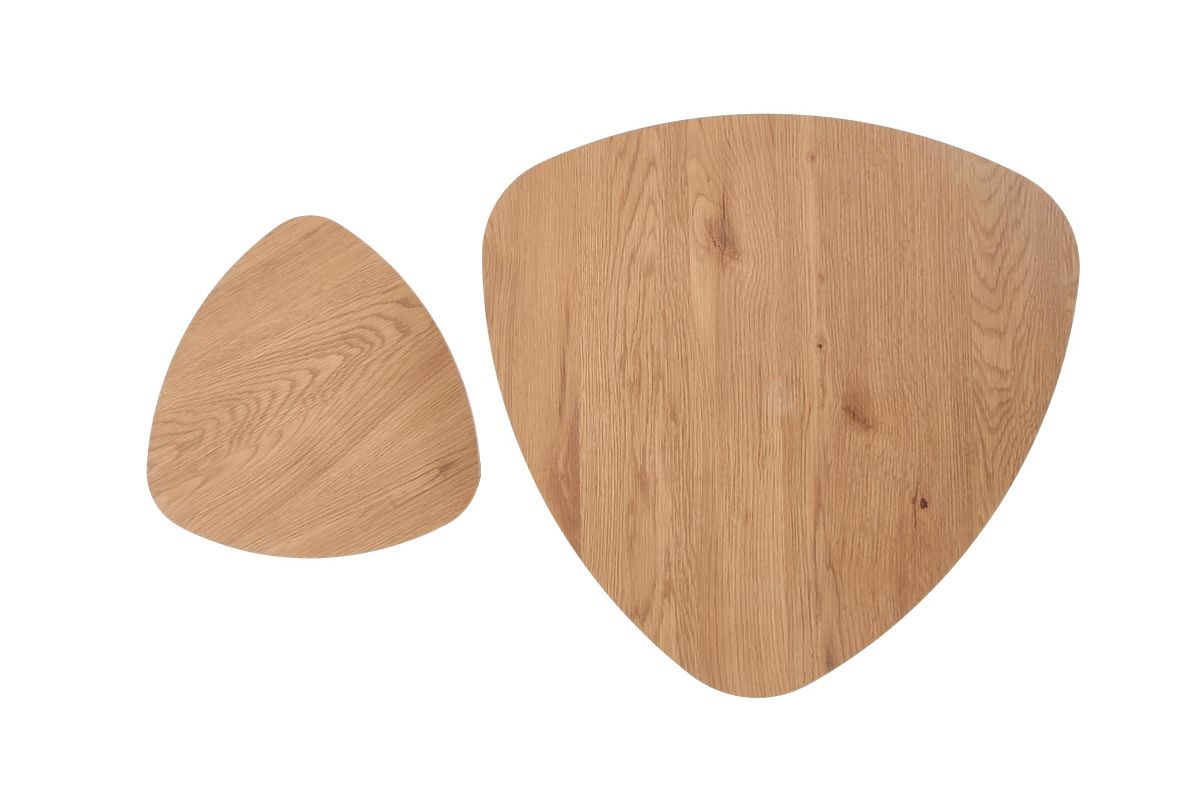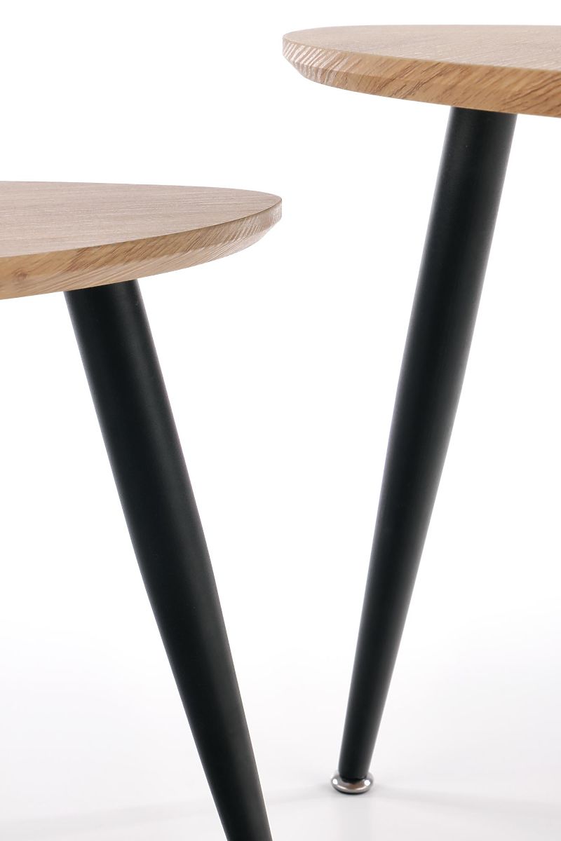 La stabilità è garantita da tre gambe in acciaio con verniciatura a polvere nera, che si assottigliano verso il basso, conferendo ai tavoli un aspetto leggero e moderno. I piani ovali in MDF impiallacciato con venature naturali visibili sottolineano il carattere senza tempo dell'intero set.