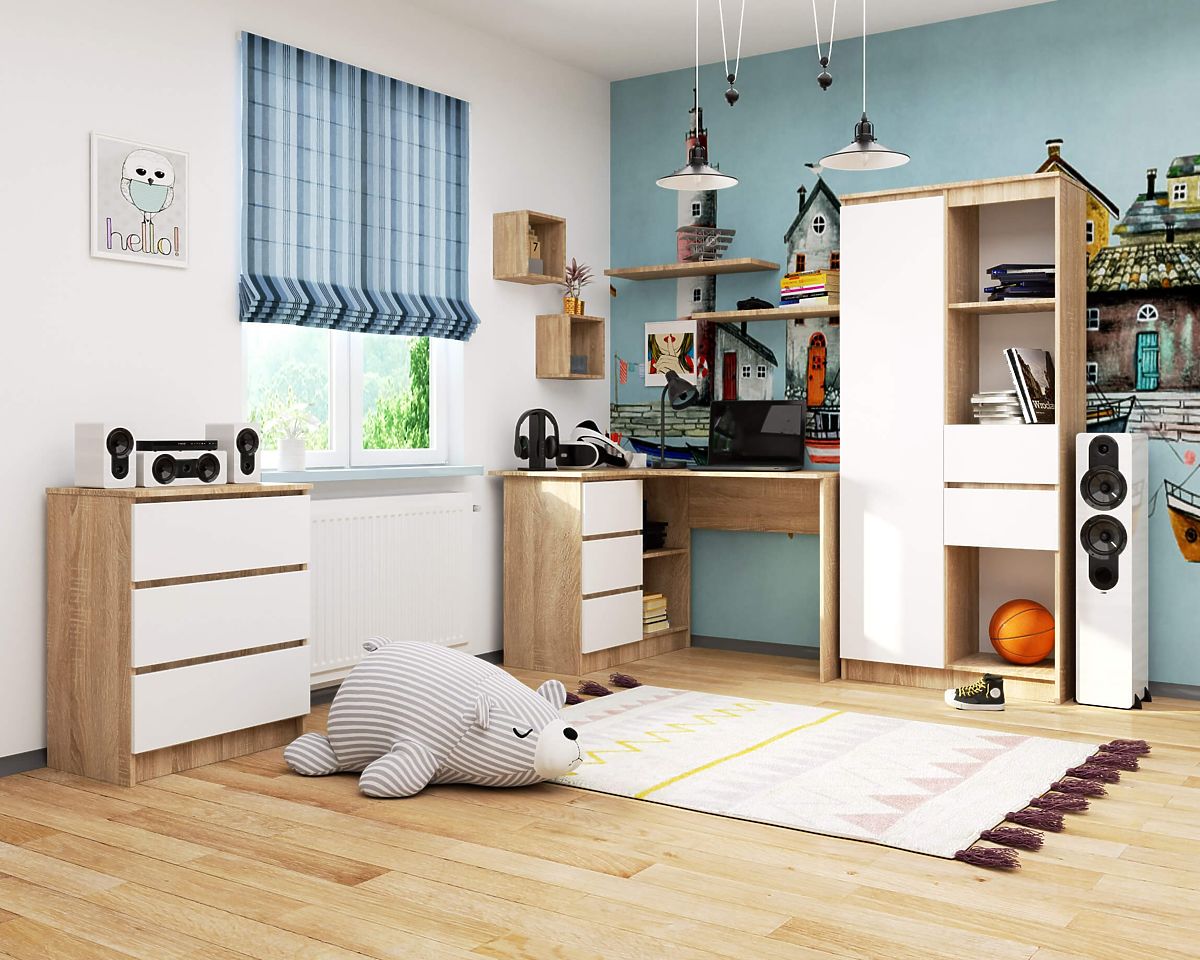 La scrivania angolare dotata di tre cassetti è un'interessante proposta per chi preferisce interni d'ufficio arredati in stile moderno. È una delicata combinazione di bianco classico e del colore molto alla moda del rovere sonoma. Il mobile è composto da una scrivania, due armadietti aperti e cassetti. L'offerta presentata si adatta bene a qualsiasi ufficio dove è importante utilizzare lo spazio nel modo più funzionale possibile. Per la produzione è stato utilizzato un pannello laminato di spessore 16 millimetri, un materiale resistente con alta resistenza ai danni. La scrivania angolare per computer soddisferà sicuramente anche i clienti più esigenti, per i quali sono importanti sia l'aspetto che la qualità e la funzionalità. Vi invitiamo inoltre a scoprire gli altri mobili di questa collezione - cassettiere, scaffali e armadi, disponibili nella stessa combinazione di colori. Grazie a loro, sarà sicuramente possibile creare uno spazio adatto per il lavoro d'ufficio o lo studio - sia a casa che in ufficio.