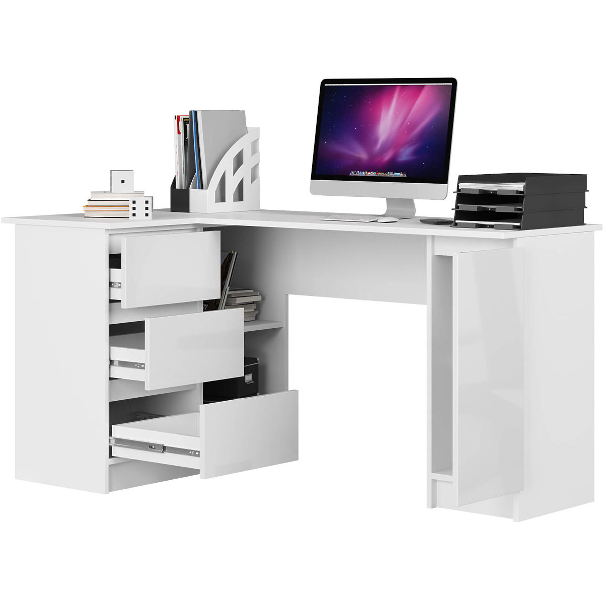 Scrivania angolare bianca per computer con cassetti e armadietto. .. altro