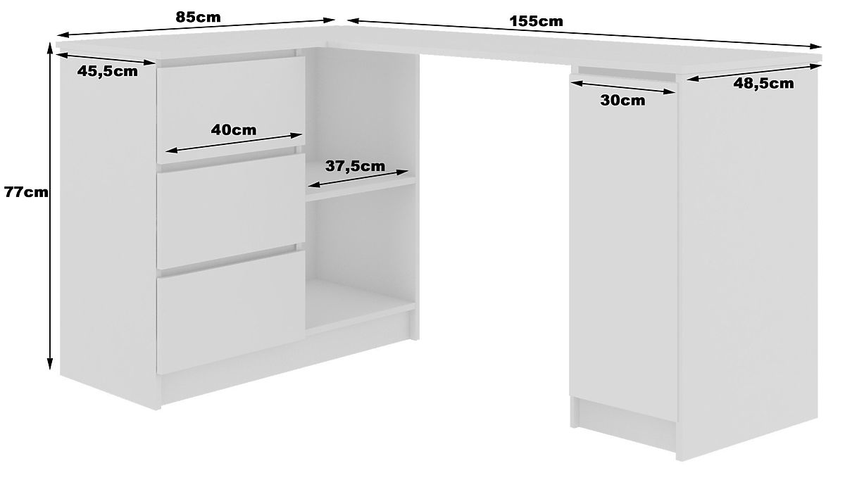 I bordi visibili sono rivestiti con bordo ABS per una maggiore resistenza ai danni. Scrivania angolare.