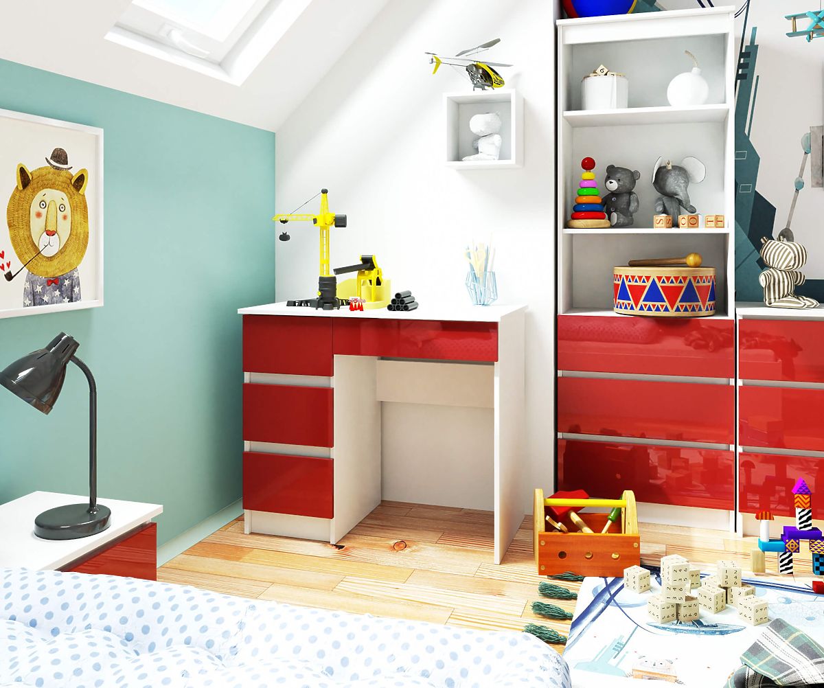 Il colore insolito della scrivania attira l'attenzione e la sua funzionalità garantisce che questo prodotto soddisfi le aspettative anche degli utenti più esigenti. Il mobile combina un corpo bianco con frontali rossi lucidi, che rendono la scrivania eccezionale. È una scelta adatta per piccoli spazi grazie alle dimensioni compatte della struttura. La scrivania per computer A-7 90 cm (sinistra) è composta da quattro cassetti. Trova impiego principalmente nelle camere per bambini e giovani, ma anche in uffici modernamente arredati.