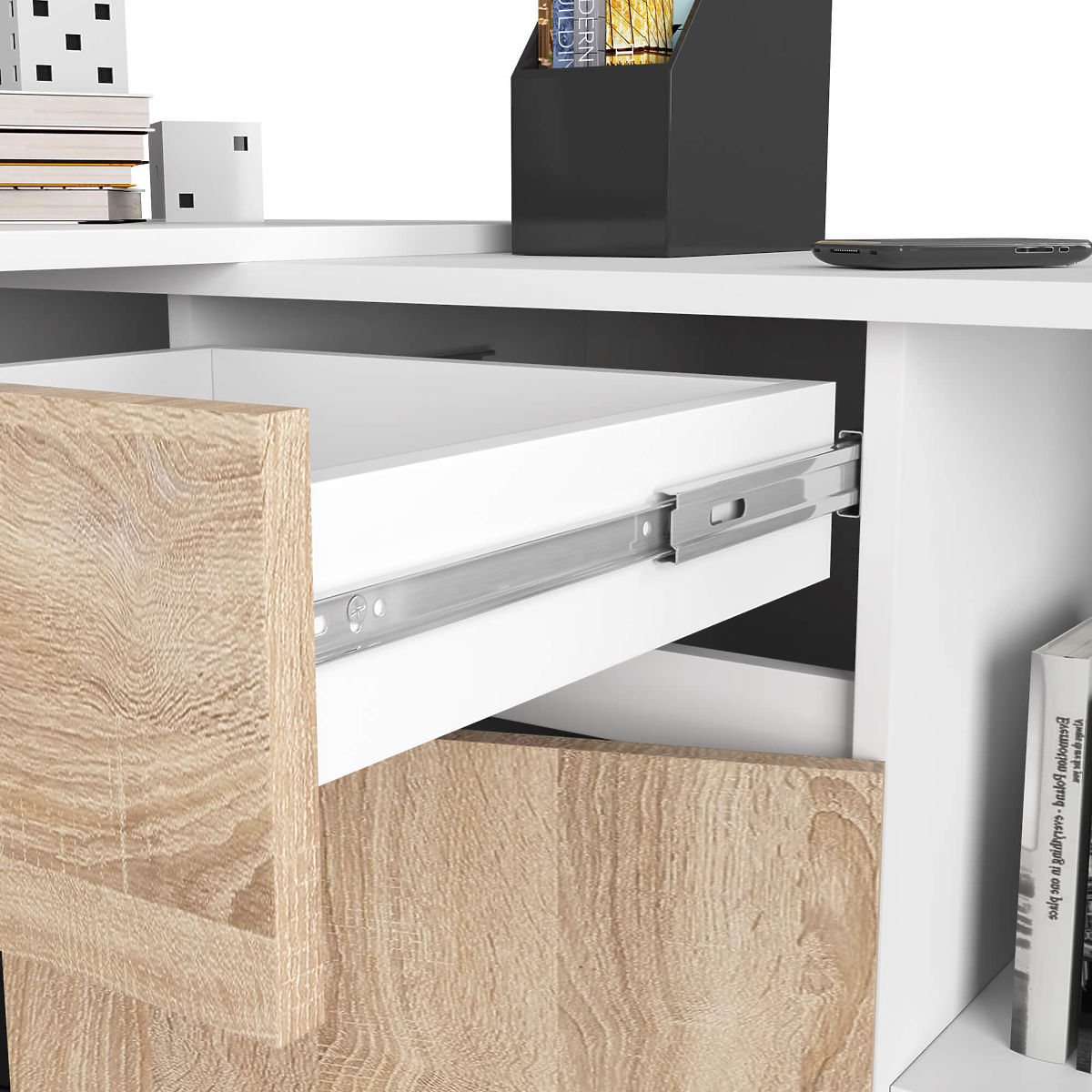 Scrivania angolare B-17 in bianco e rovere sonoma con credenza combinabile. .. altro