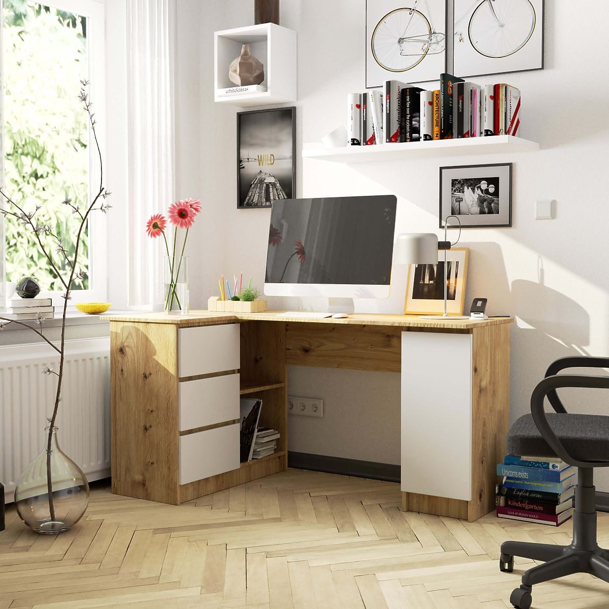 La scrivania angolare B20 155 cm SINISTRA in colore Rovere Artisan con frontali bianchi è un elegante mobile da ufficio con design moderno. Sarà un'ottima scelta per uffici domestici e camere per bambini. La scrivania angolare si integra nell'arredamento della stanza e crea uno spazio adeguato per lavorare e studiare. Grazie ai cassetti, mensole e armadietto, posizionati su entrambi i lati della scrivania, gli oggetti necessari saranno a portata di mano. È anche facile organizzare documenti, libri o forniture per ufficio, che possono essere riposti nei capienti cassetti che scorrono su guide a rulli. La scrivania è realizzata in pannello laminato di spessore 16 mm del marchio Kronospan, resistente all'usura, garantendo una lunga durata della scrivania. I bordi del mobile sono rivestiti con bordo ABS, che assicura resistenza ai danni meccanici della scrivania.