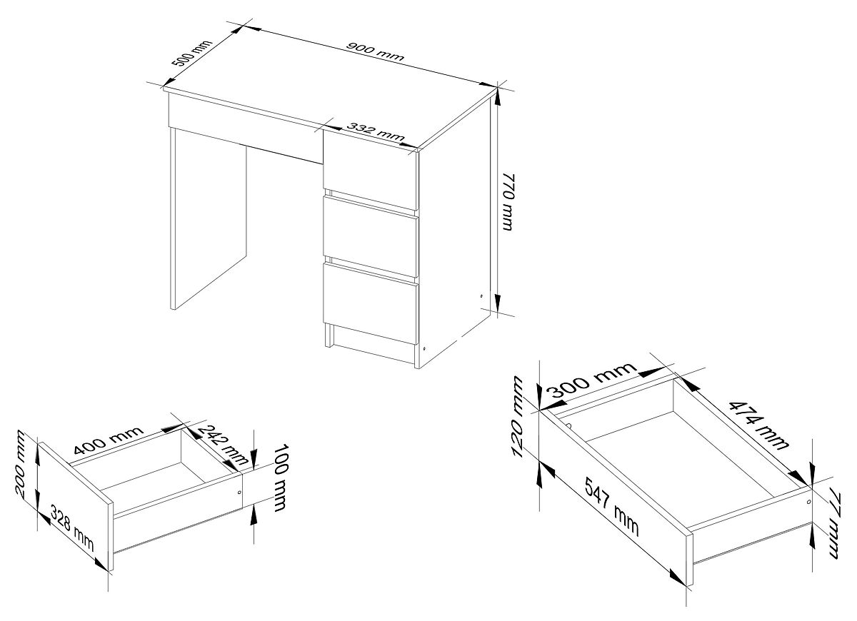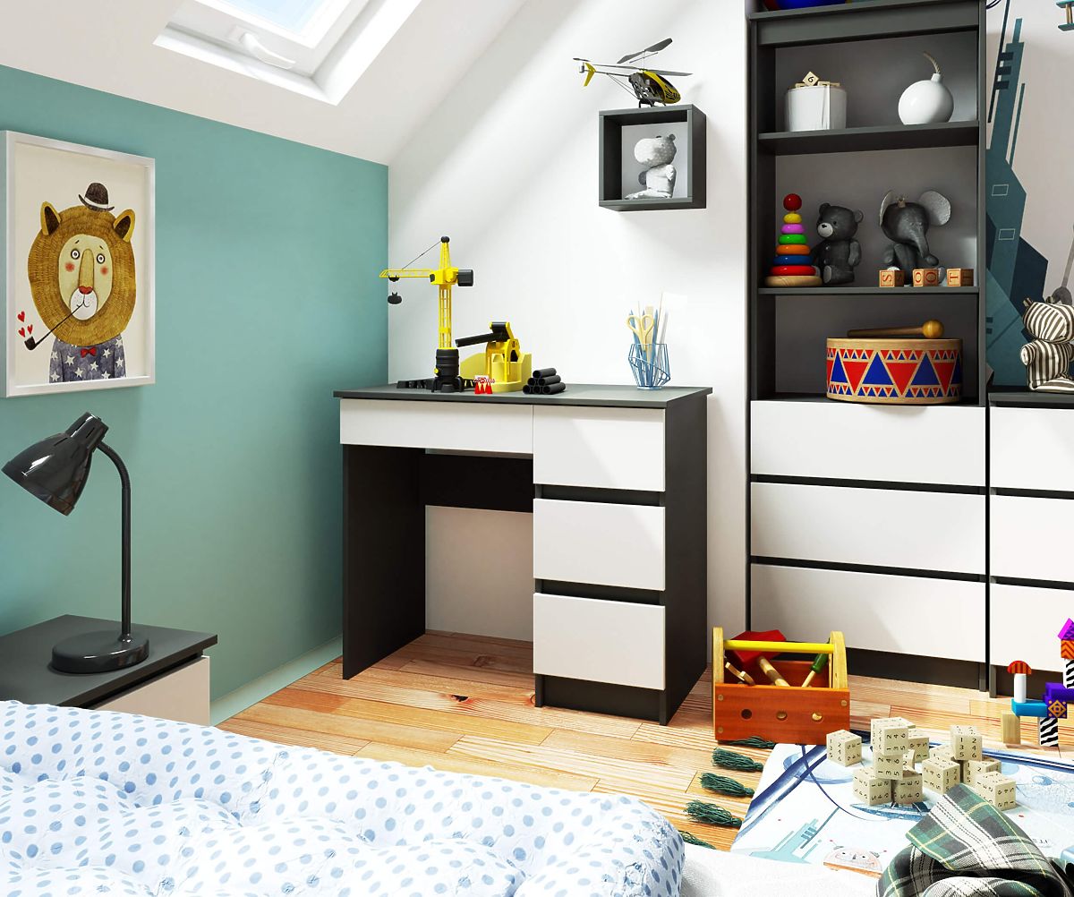 La scrivania per computer A-7 è un piccolo pezzo di arredamento che trova impiego in spazi ridotti, sia in ufficio che in casa. È ideale per uno studio domestico o una camera per bambini/adolescenti. Il prodotto presentato combina due colori contrastanti ma complementari: grigio grafite e bianco. È composta da tre cassetti utilizzabili a piacere. Un mobile semplice nella forma ma estremamente funzionale, apprezzato da chi desidera creare un angolo di lavoro o studio senza disporre di molto spazio.