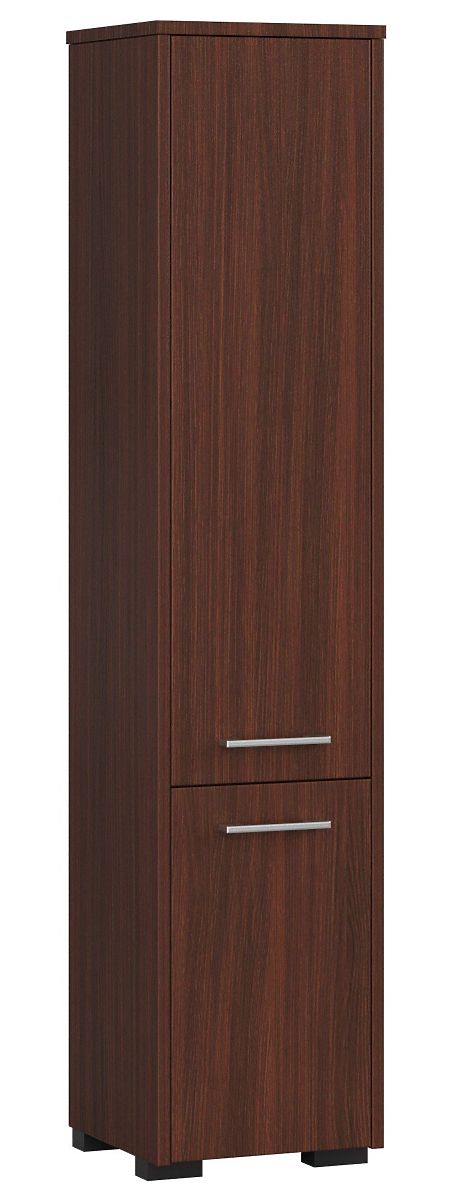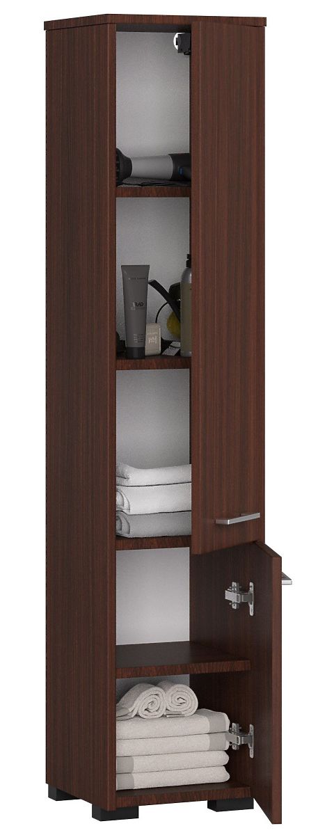 La colonna da bagno a due ante offerta dal nostro negozio è un prodotto che permette di sfruttare correttamente lo spazio disponibile e di aumentarne anche il valore estetico. Questo perché è ottimamente funzionale e stiloso. Questo mobile è composto da due ante – una più grande in alto e una più piccola in basso. Dietro di esse si trova uno scaffale pratico. I ripiani permettono di riporre vari oggetti necessari in bagno, come asciugamani, detergenti, prodotti igienici e detersivi. Questa colonna estremamente spaziosa può sicuramente contenere gli accessori di tutta la famiglia. La sua bellissima tonalità wenge merita attenzione. È un colore classico che dona alla stanza un'eleganza adeguata. Sulle ante sono montate maniglie molto stilose per l'apertura. Le sue dimensioni permettono di posizionarla in un bagno dove abbiamo poco spazio disponibile. Grazie alla forma ergonomica si adatta a ogni stanza. I bordi della colonna sono rivestiti con materiale ABS, garantendo che non si danneggino neanche con un uso prolungato del mobile. Inoltre, il pannello laminato contribuisce all'eccezionale durata della colonna.