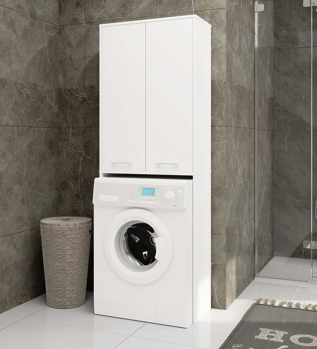 Colonna bagno bianca sopra lavatrice con ampio spazio di archiviazione. .. altro