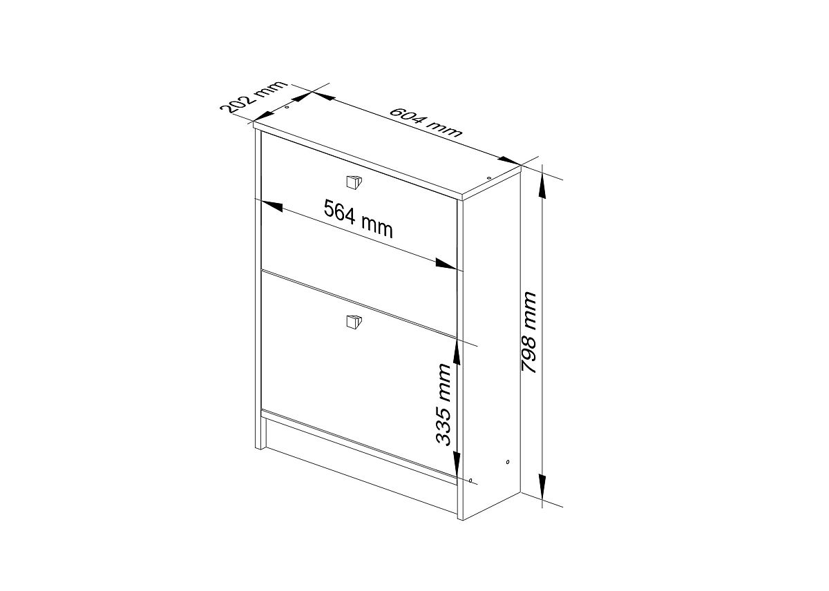 La scarpiera che abbiamo l'onore di presentare ricorda una cassettiera. Invece di armadietti o cassetti, è dotata di due spazi di stoccaggio per le scarpe, che possono contenere senza problemi diversi o addirittura decine di paia di scarpe. I cassetti si ribaltano verso il basso, consentendo un facile accesso agli oggetti riposti. Le scarpe in una scarpiera del genere possono essere riposte sia liberamente che in scatole. Il mobile è realizzato in pannello laminato resistente, solido e resistente ai graffi, in un colore wenge alla moda e richiesto dai clienti del nostro negozio online. Meritano attenzione anche le maniglie effetto.
