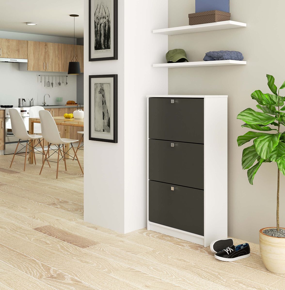 Scarpiera bianca con frontali in grafite grigio e 3 ante a ribalta. .. altro