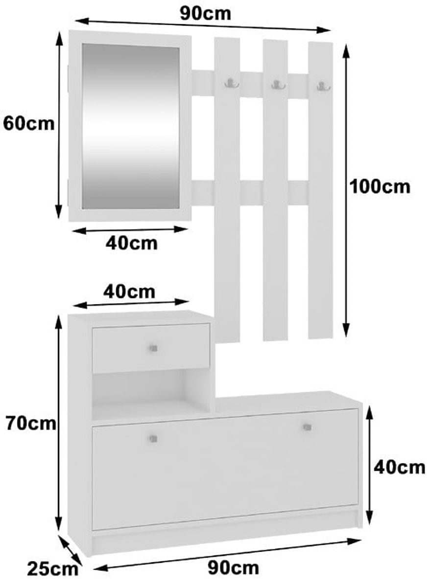 Cerchi un set di mobili elegante per l'ingresso? Vuoi sfruttare al meglio uno spazio piccolo? Se sì, sei nel posto giusto. I mobili per ingresso con appendiabiti e scarpiera sono indispensabili in ogni appartamento o casa. Il set bianco per ingresso si combina molto bene con altri colori. Le persone stanno tornando sempre più spesso ai colori tradizionali e apprezzano il minimalismo. La scarpiera è molto spaziosa e progettata in modo interessante, poiché sopra di essa c'è una nicchia e un piccolo cassetto dove puoi riporre chiavi o altri piccoli oggetti necessari. Un complemento pratico dell'appendiabiti è lo specchio. Chiunque esca di casa vuole controllare il proprio aspetto. I mobili sono realizzati in pannello laminato resistente all'abrasione. Questa è una caratteristica molto importante, poiché i bambini spesso lanciano lo zaino pesante sull'armadietto quando tornano a casa ed è bene che sia protetto dai danni. Il set di mobili per ingresso presentato è quindi funzionale e esteticamente lavorato.