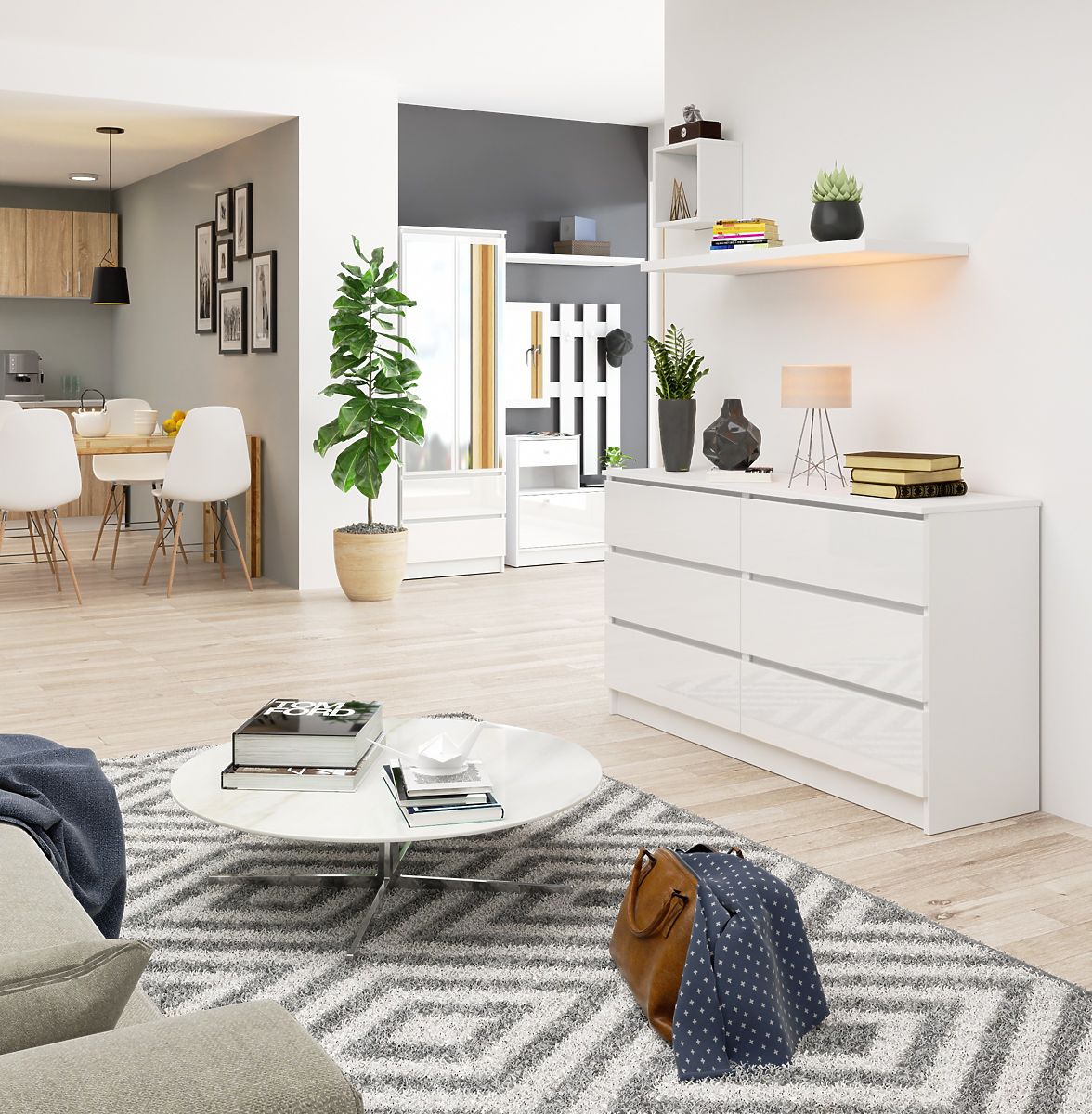 Comò bianco lucido con 6 cassetti e bordi protetti in ABS. .. altro