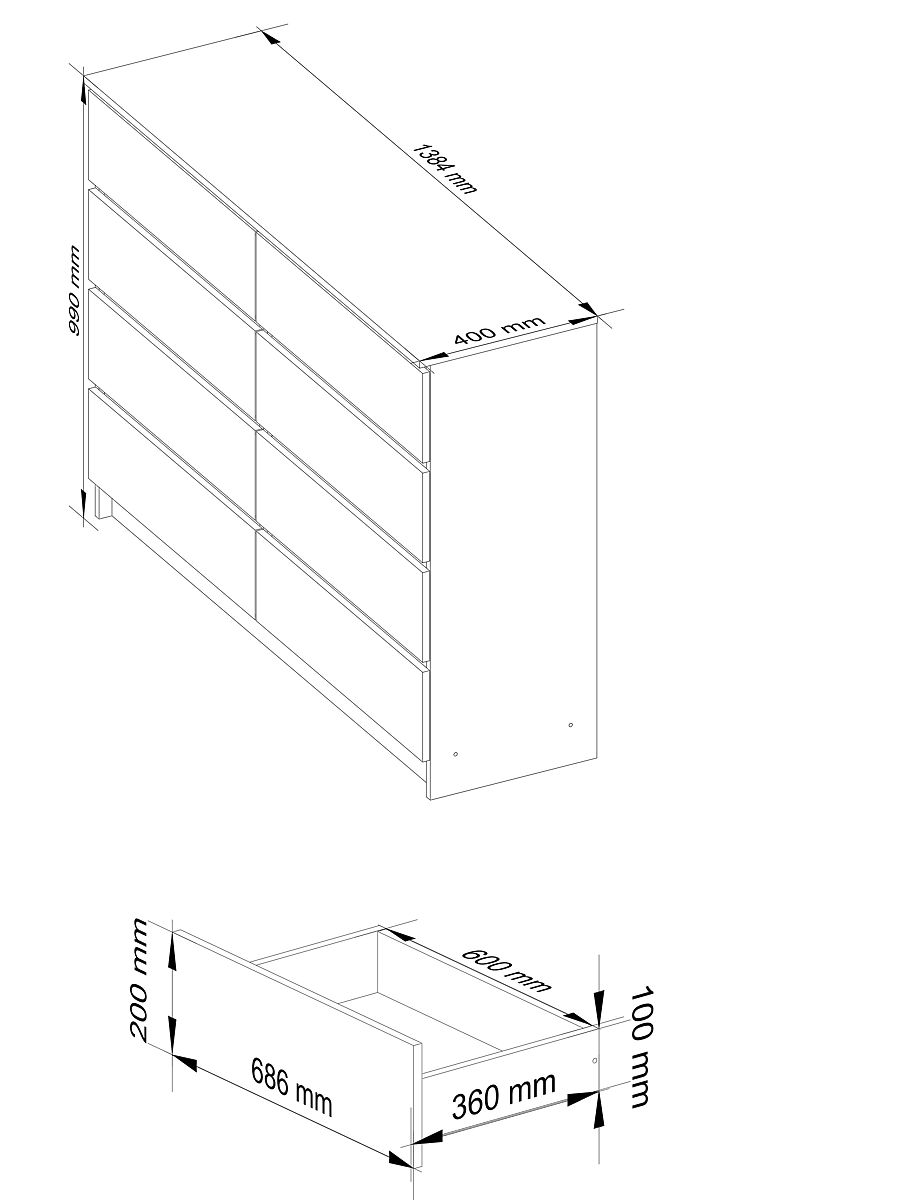 CREDENZA K140 8 CASSETTI Realizzata in pannello laminato da 16mm resistente all'abrasione.