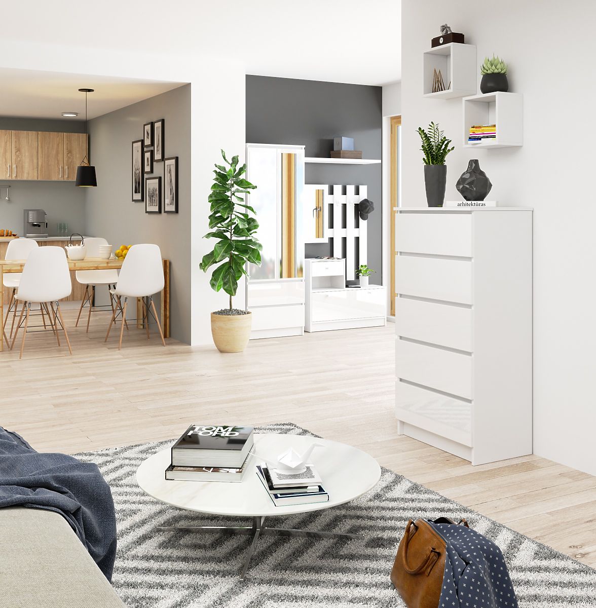 Il comò spazioso dotato di quattro cassetti è un mobile che trova applicazione in molti spazi abitativi e uffici. Permette l'organizzazione dello spazio di archiviazione per oggetti essenziali in camera da letto, soggiorno, camera dei bambini o degli studenti. Si adatta perfettamente anche all'ufficio domestico o all'ingresso. Combina un aspetto semplice ed elegante, colori senza tempo e una costruzione solida. Il COMÒ K 60 cm in colore bianco è dotato di frontali acrilici ad alto lucido.