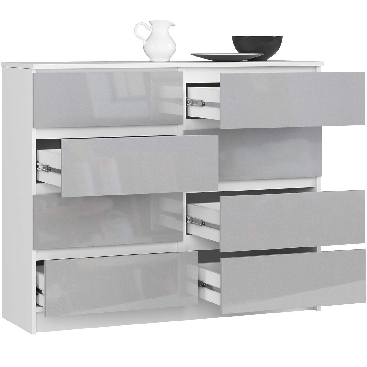Offriamo un grande comò con 8 cassetti. Il comò ha un corpo bianco semi-opaco realizzato in pannello laminato di spessore 16 mm, molto resistente all'abrasione. I frontali sono realizzati in pannello MDF con rivestimento acrilico di spessore 19 mm, caratterizzato da alta durabilità e resistenza allo sbiadimento dovuto alla luce solare intensa. I bordi sono dotati di bordo ABS che garantisce alta protezione contro danni meccanici e abrasioni. I cassetti senza maniglie hanno un moderno colore metallico ad alta lucentezza. I cassetti scorrono su guide a sfera metalliche. Il comò ha un aspetto semplice e allo stesso tempo molto universale. Si adatta perfettamente a qualsiasi interno, apparirà altrettanto bene nel soggiorno, nella camera da letto o persino in ufficio. Grazie ai cassetti molto spaziosi e capienti, ogni stanza sarà ordinata. A questo modello di comò è possibile abbinare con successo altri mobili della serie CLP.