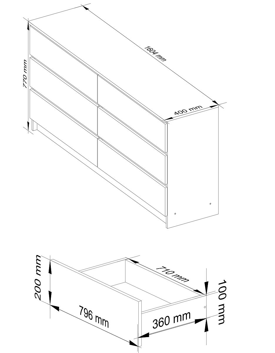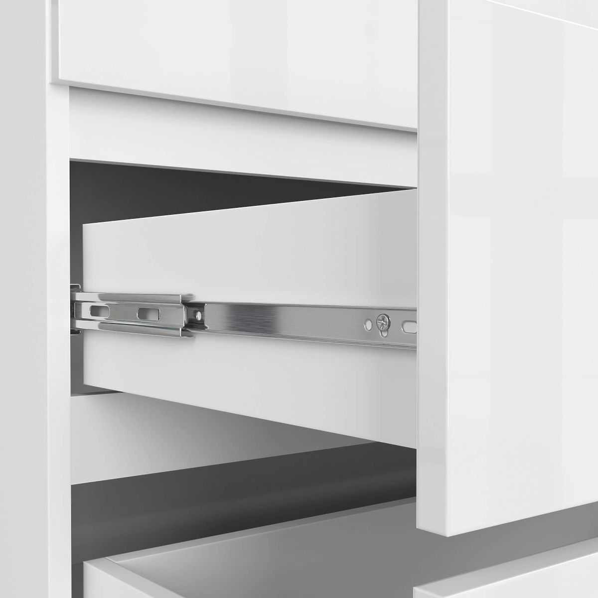 - Corpo del comò realizzato in pannello laminato bianco opaco da 16 mm resistente all'abrasione