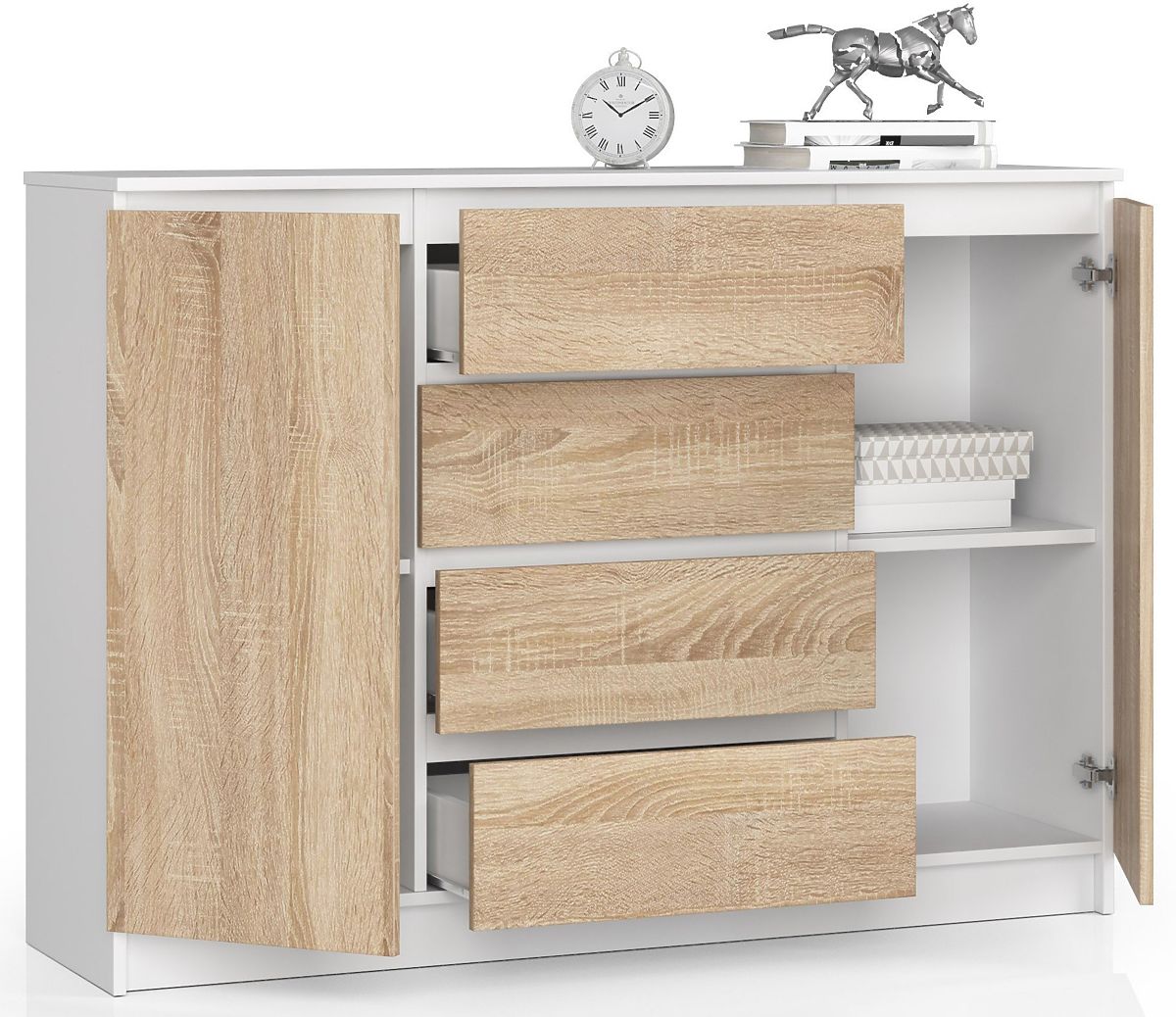 La credenza K 140 con 4 cassetti è realizzata in resistente pannello laminato Kronospan. Il corpo della K 140 è di colore bianco, mentre i frontali degli armadietti e dei cassetti sono in colore rovere sonoma. La parte centrale della credenza è costituita da una fila di 4 cassetti disposti uno sopra l'altro, mentre su entrambi i lati della credenza sono progettate singole ante. I cassetti scorrono grazie a guide a rulli in metallo, offrendo un ampio spazio di archiviazione. Aprendo le ante, l'utente può utilizzare due armadietti dotati di due ripiani ciascuno.
