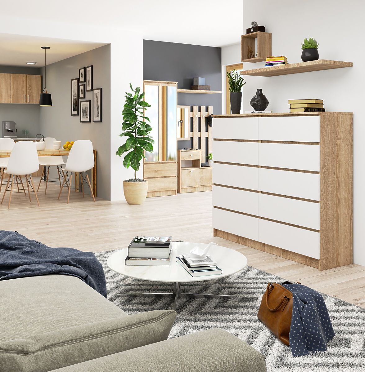 Il rovere sonoma è recentemente diventato uno dei colori più popolari per i mobili. Ha guadagnato il riconoscimento dei clienti grazie alla sua natura estremamente versatile. Inoltre, i mobili in colore rovere sonoma sono molto facili da pulire, il che rappresenta un indubbio vantaggio. Un altro colore altrettanto popolare è il bianco senza tempo. I mobili che offriamo sono una delicata combinazione di questi due colori, che ha portato a un effetto eccellente.