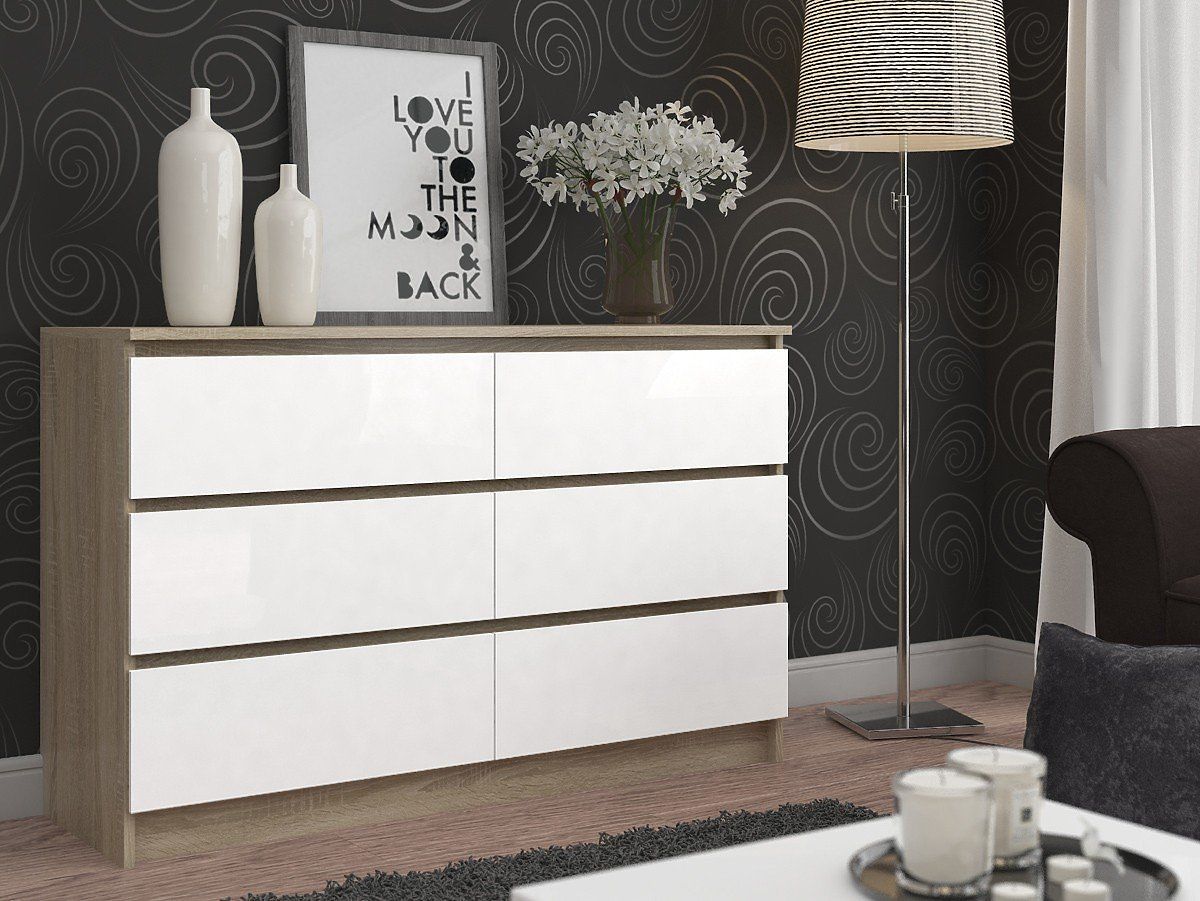 Elegante, stiloso e moderno. Questi tre aggettivi descrivono il nostro comò. Rifinito in colori senza tempo. Il corpo è in colore rovere sonoma, mentre i frontali dei cassetti sono bianchi. L'offerta che proponiamo ai nostri clienti ha una lunghezza di 120 centimetri, un'altezza di 77 centimetri e una profondità di 40 centimetri. Proprio quest'ultima dimensione rende il nostro mobile così spazioso. Naturalmente, anche i sei cassetti per vari accessori, vestiti e scarpe giocano un ruolo importante. I cassetti già menzionati si muovono dolcemente e precisamente, tutto grazie alle guide a sfera in metallo.