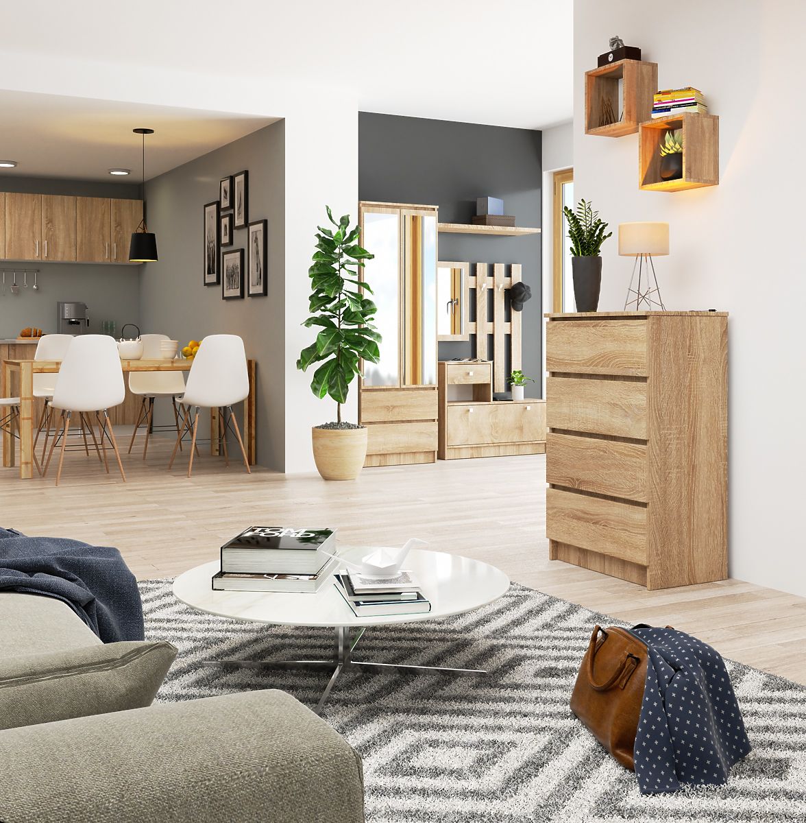 La piccola credenza K60 è una proposta mantenuta in una tonalità alla moda, molto popolare tra i clienti. Ovviamente si tratta di rovere sonoma - una tonalità che si adatta perfettamente agli interni moderni, è molto versatile e si combina meravigliosamente con tutti gli altri colori. La stessa credenza è un mobile di alta qualità, dotato di quattro pratici cassetti. La proposta è destinata a chi desidera arredare il proprio soggiorno, camera da letto, ingresso, sala da pranzo, ma anche l'interno di un ufficio. L'alta qualità combinata con il basso prezzo convincerà sicuramente i clienti che apprezzano la semplicità e l'eleganza nella migliore realizzazione. Alla credenza si può abbinare altro arredamento della stessa collezione, creando così l'arredamento dei sogni per qualsiasi spazio scelto.