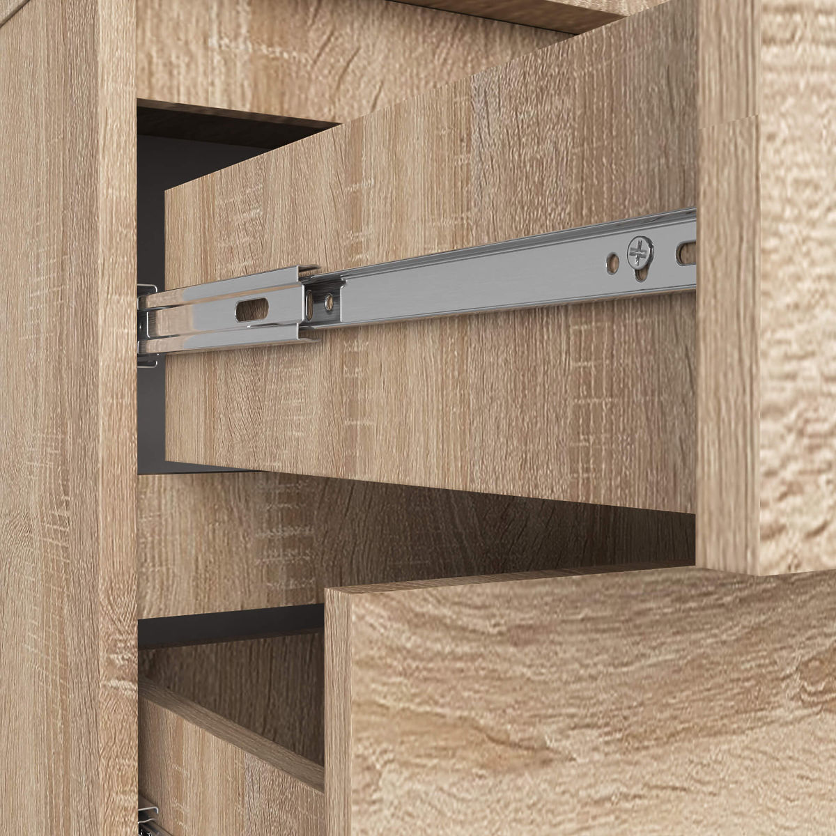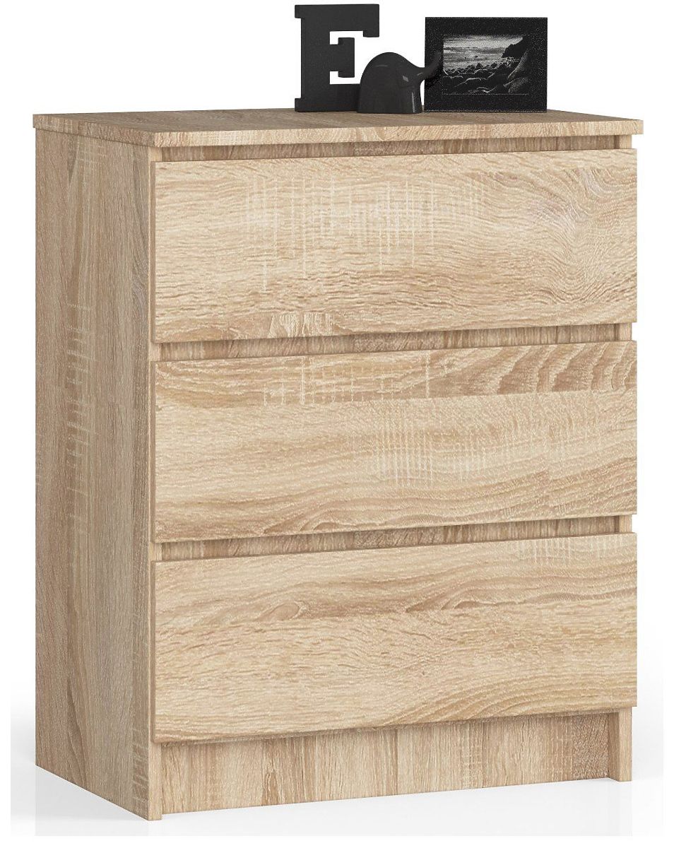 Piccolo ma spazioso comò con tre cassetti, la cui finitura soddisferà le aspettative dei clienti più esigenti. È stato utilizzato il rovere sonoma, un colore che si adatta perfettamente agli interni chiari. Il prodotto è adatto per la camera da letto, il soggiorno, la stanza o l'ingresso, a seconda delle esigenze dei nostri clienti. Offriamo un pezzo realizzato in pannello laminato con uno spessore fino a 16 millimetri. È un materiale resistente all'abrasione, ulteriormente rinforzato con bordo ABS. Il modello utilizza cassetti che scorrono su guide a sfera in metallo, garantendo un movimento fluido, delicato e preciso.
