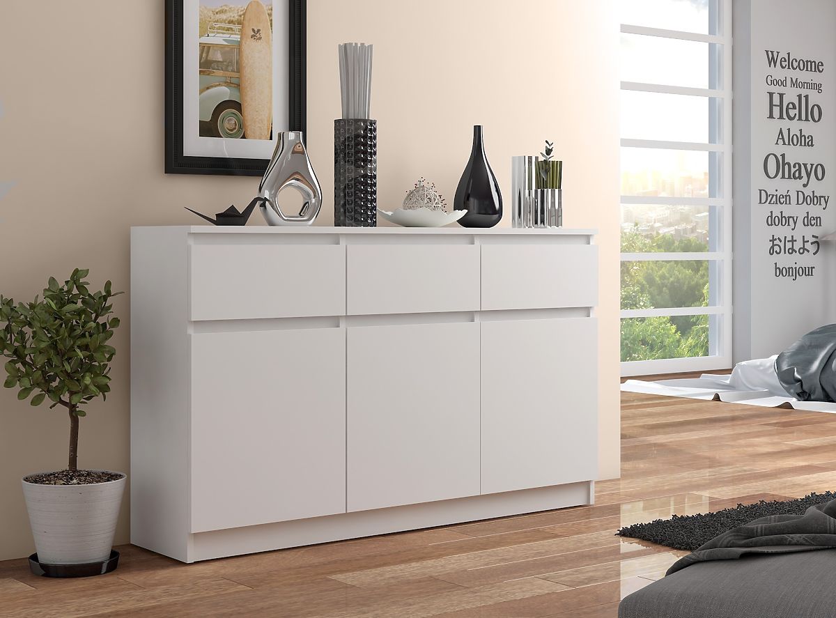 Presentiamo una credenza straordinariamente elegante, realizzata in pannello laminato di alta qualità. Ha uno spessore di 16 mm ed è resistente all'abrasione. Proviene dal rinomato produttore Kronospan, il che garantisce la sua durata. La credenza ha tre cassetti e tre armadietti. I cassetti scorrono su guide a sfere metalliche, garantendo fluidità e leggerezza nell'apertura e chiusura. Ogni armadietto ha un ripiano spazioso, accessibile tramite un'anta. I bordi del mobile sono rivestiti con bordo ABS, che offre un'elevata protezione contro i danni.