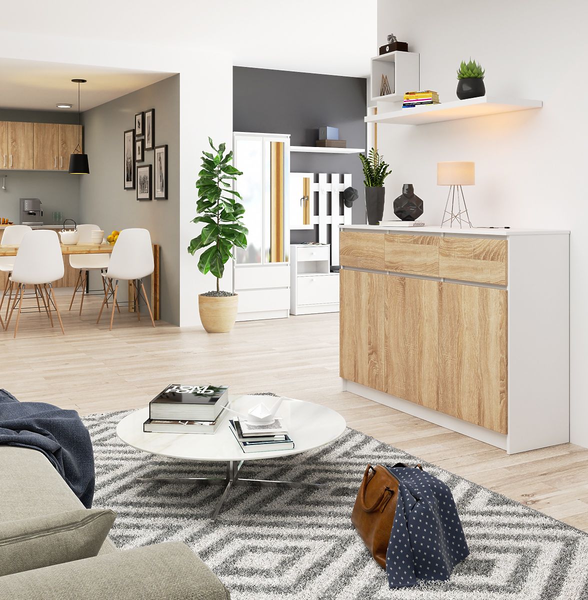 Credenza bianca con frontali in rovere Sonoma e tre cassetti. .. altro