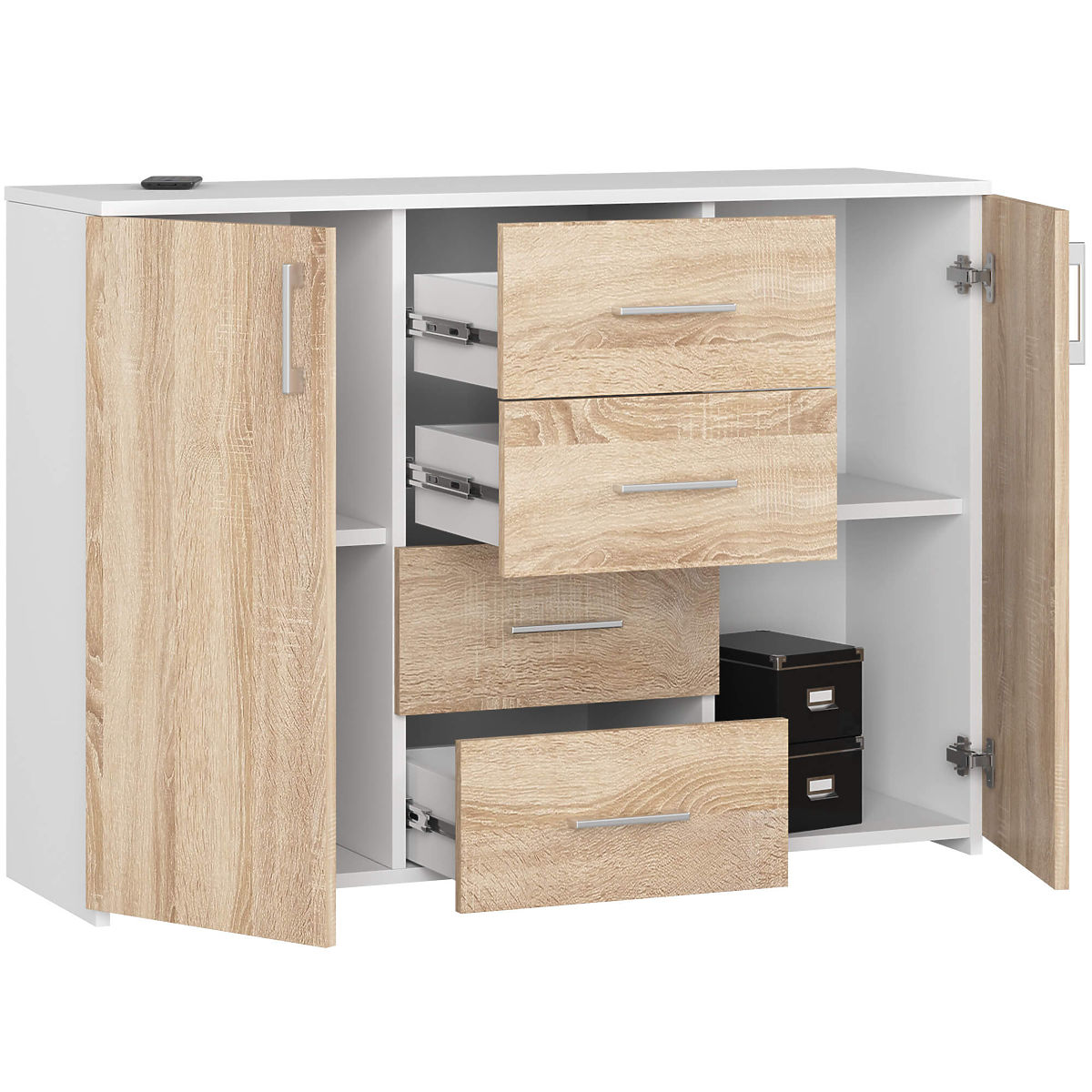 Comò in laminato bianco e rovere Sonoma con 4 cassetti e 2 ante. .. altro