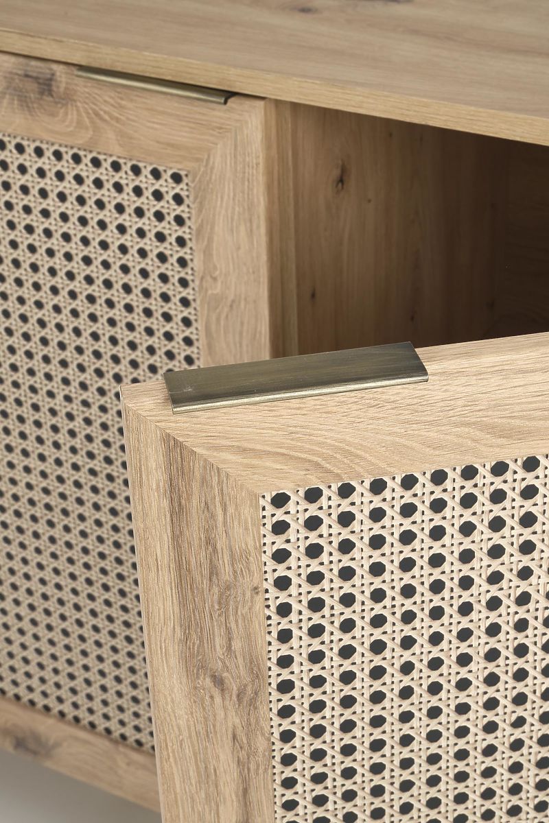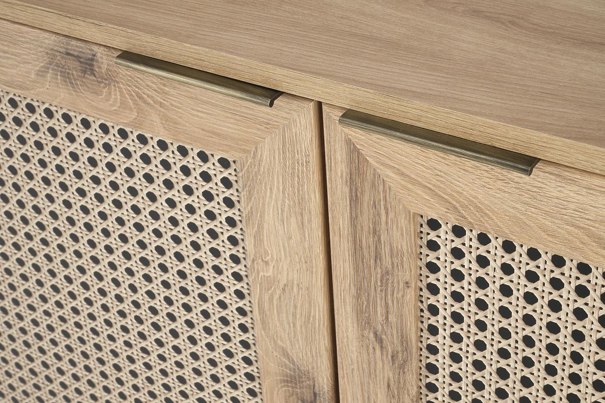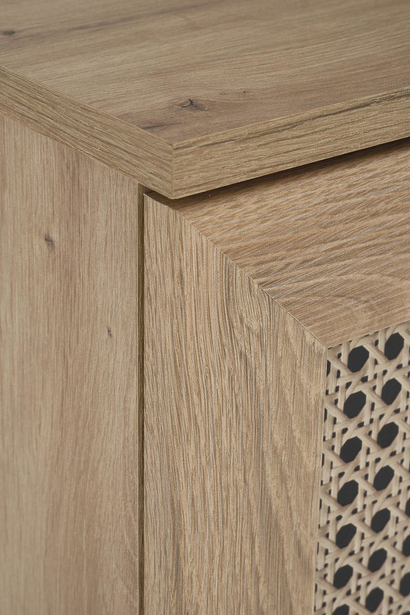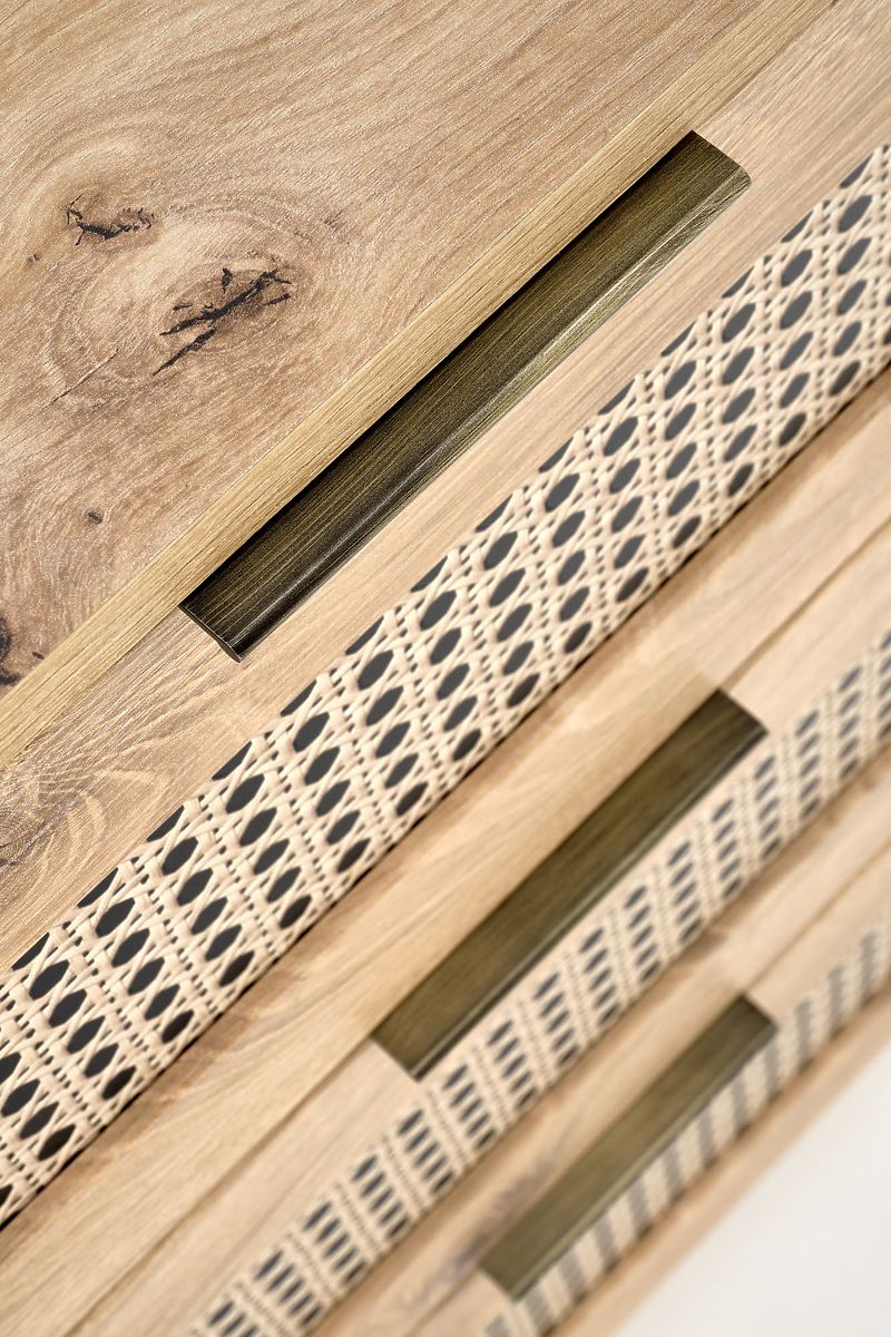 Il decoro in rovere artisan insieme agli inserti alla moda con motivo a treccia viennese conferisce alla cassettiera un tocco boho unico che cattura immediatamente l'attenzione.