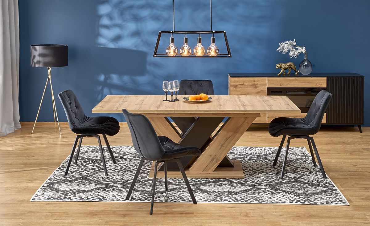 Il design interessante delle gambe, realizzate con un pannello che combina le finiture rovere wotan e nero, conferisce al tavolo un aspetto unico e crea un elemento distintivo nell'interior design. La struttura a forma di X garantisce inoltre eccellente stabilità e robustezza, evitando oscillazioni o spostamenti indesiderati.