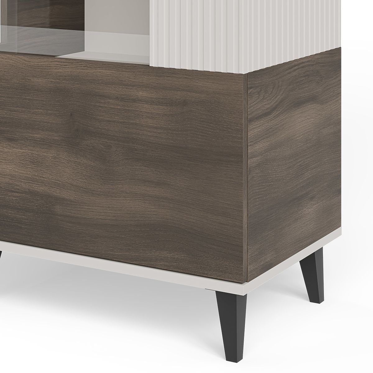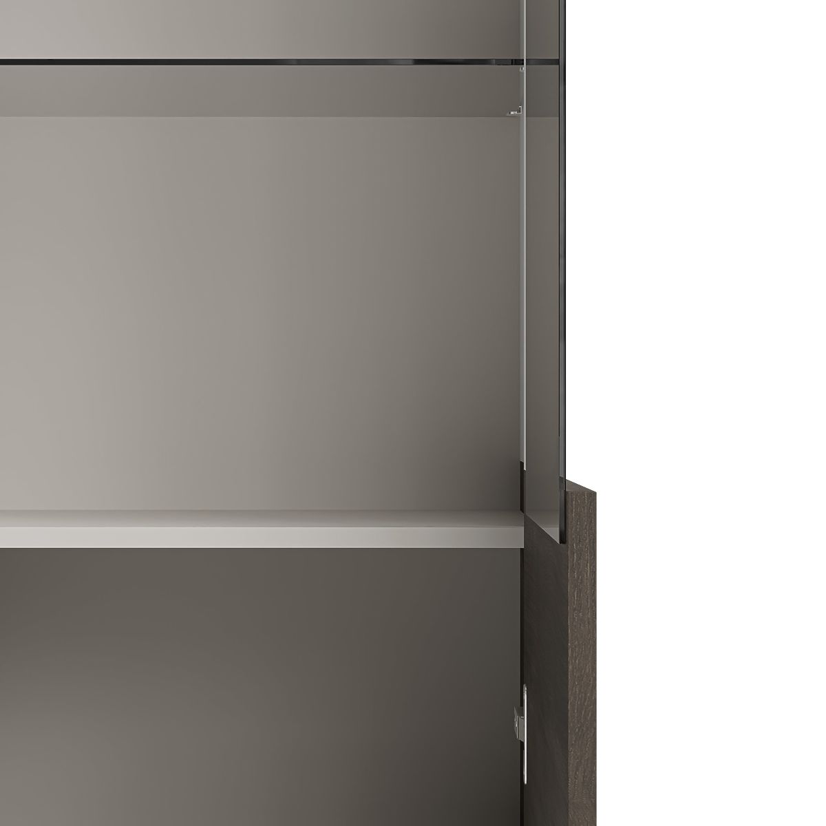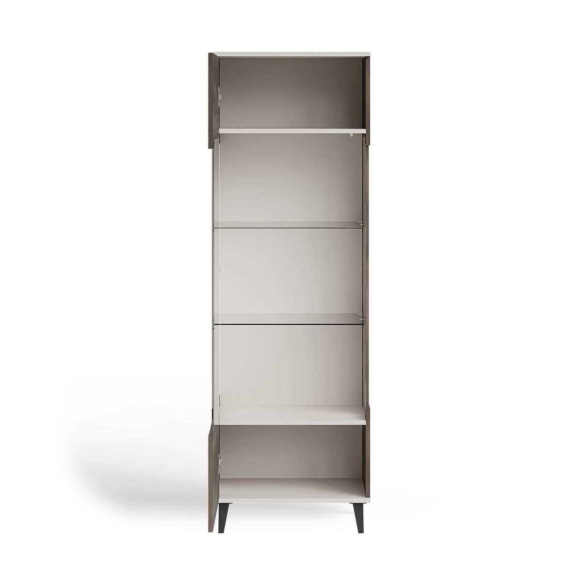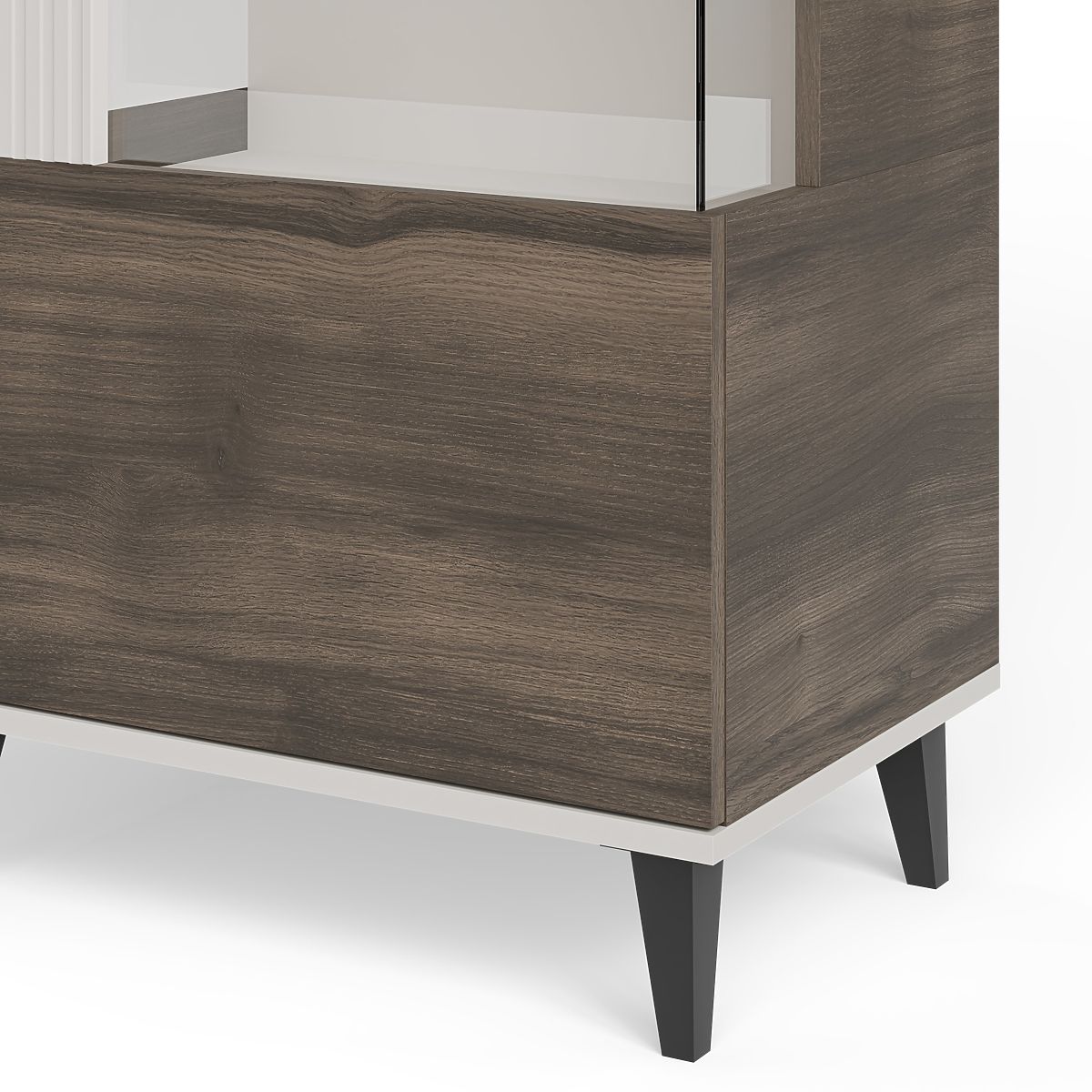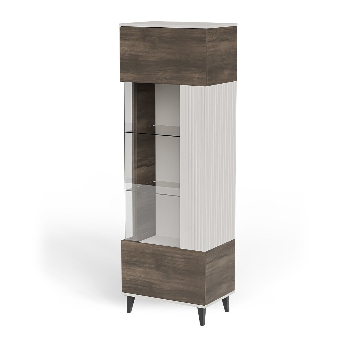 La vetrina RANDOM è un complemento elegante e distintivo per il tuo interno, che attira immediatamente l'attenzione. Il "tendaggio" nero leggermente arricciato sul lato copre con stile le ante in vetro, aggiungendo un tocco di mistero e sofisticatezza alla vetrina. La combinazione armoniosa di cashmere, legno di noce e dettagli neri crea un aspetto moderno e senza tempo, perfetto per soggiorni, camere da letto, studi e ingressi. Dietro le ante in vetro si trovano tre ampi ripiani, ideali per esporre decorazioni, libri, ricordi personali o altri piccoli oggetti. Con un'altezza di 182 cm, la vetrina offre abbondante spazio di archiviazione senza perdere leggerezza visiva ed eleganza. I piedi bassi della vetrina, inclinati ad angolo ottuso, garantiscono stabilità e una base solida, mentre i materiali di qualità – pannello impiallacciato MDF, pannello per mobili impiallacciato e elementi in polipropilene – assicurano lunga durata e resistenza all'uso quotidiano. La vetrina RANDOM è quindi non solo bella da vedere, ma anche funzionale e pratica.