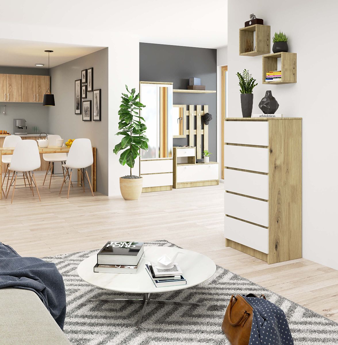 Comò con 5 cassetti in rovere artigiano e frontali bianchi. .. altro